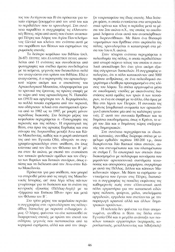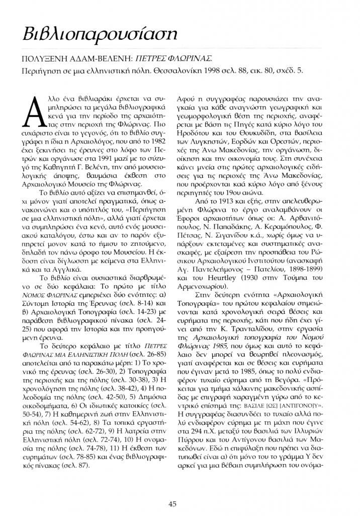 Ανδρέου Ανδρέας Π., «Βιβλιοπαρουσίαση. Πολυξένη Αδάμ-Βελένη: Πέτρες Φλώρινας. Περιήγηση σε μια ελληνιστική πόλη. Θεσσαλονίκη 1998 σελ. 88, εικ. 80, σχέδ. 5», Εταιρία, τχ. 31 (Δεκέμβριος 1998), σ. 45-47