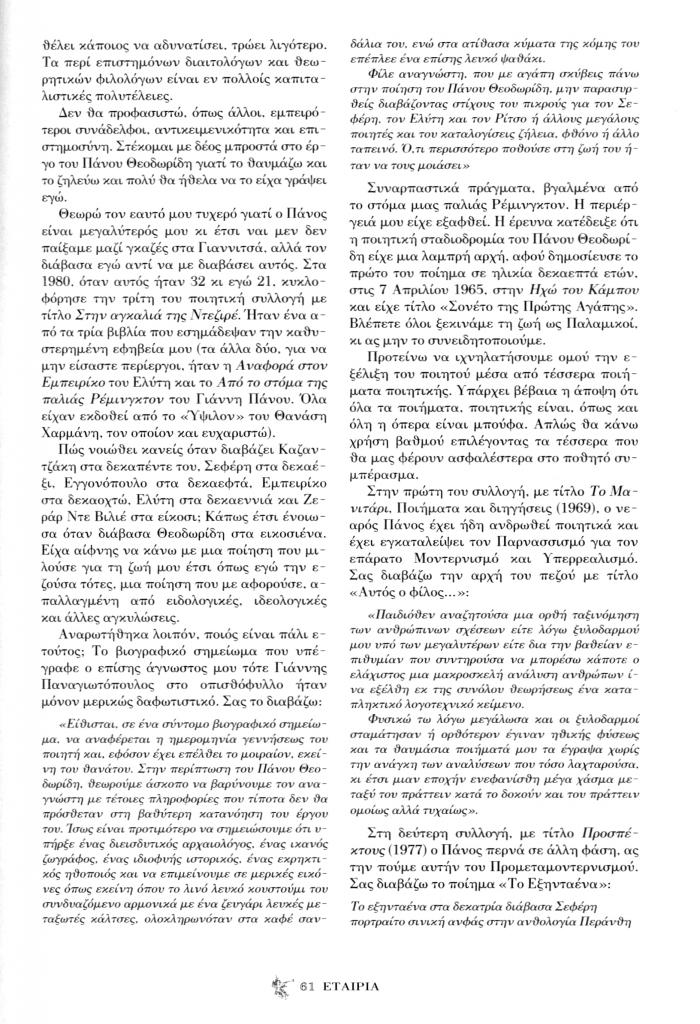 Σαββίδης Μανόλης, «Εταιρικά. Το έργο του Πάνου Θεοδωρίδη», Εταιρία, τχ. 35 (Δεκέμβριος 2000), σ. 60-62