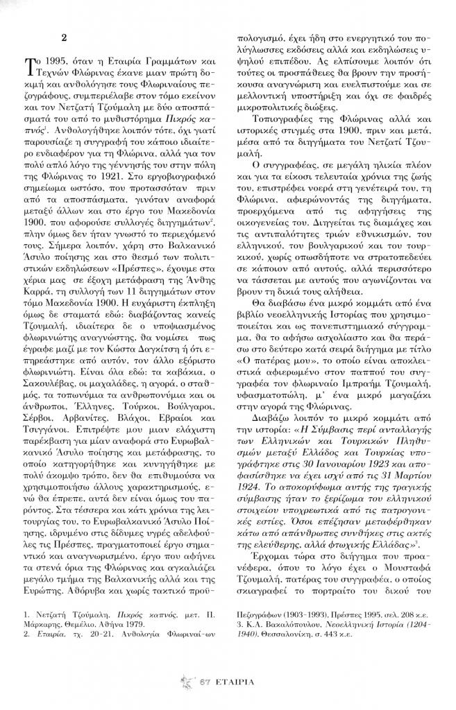 Ανδρέου Ανδρέας Π., «Εταιρικά. Διαβάζοντας τη συλλογή του Νετζατή Τζουμαλή Μακεδονία 1900, Πρέσπες 2001 - Βαλκανικό Άσυλο Ποίησης, μετάφραση Ανθή Καρρά. 2», Εταιρία, τχ. 36 (Δεκέμβριος 2001), σ. 67-69