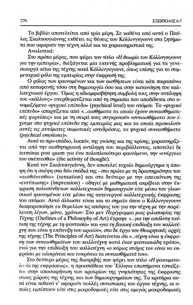 Μανάκας Γιώργος, «Παύλος Δ. Σκαλτσογιάννης: Η τέχνη ως έκφραση – κριτική εξέταση της θεωρίας του Ρ. Τζ. Κόλλινγκγουντ για την έκφραση. Έκδοση Ιδρύματος Παναγιώτη και Έφης Μιχελή, Αθήνα 1994», Εξώπολις, τχ. 6-7 (Χειμώνας 1997), σ. 269-271