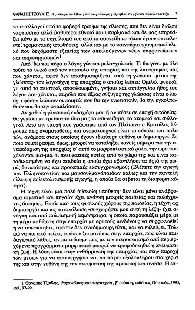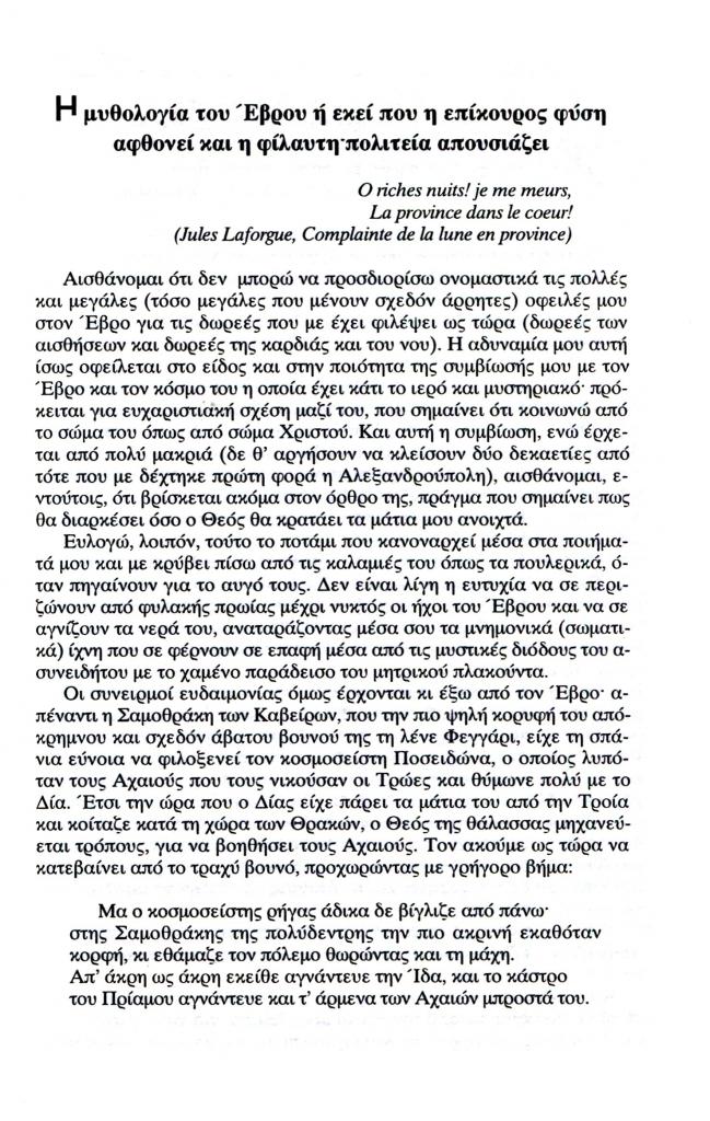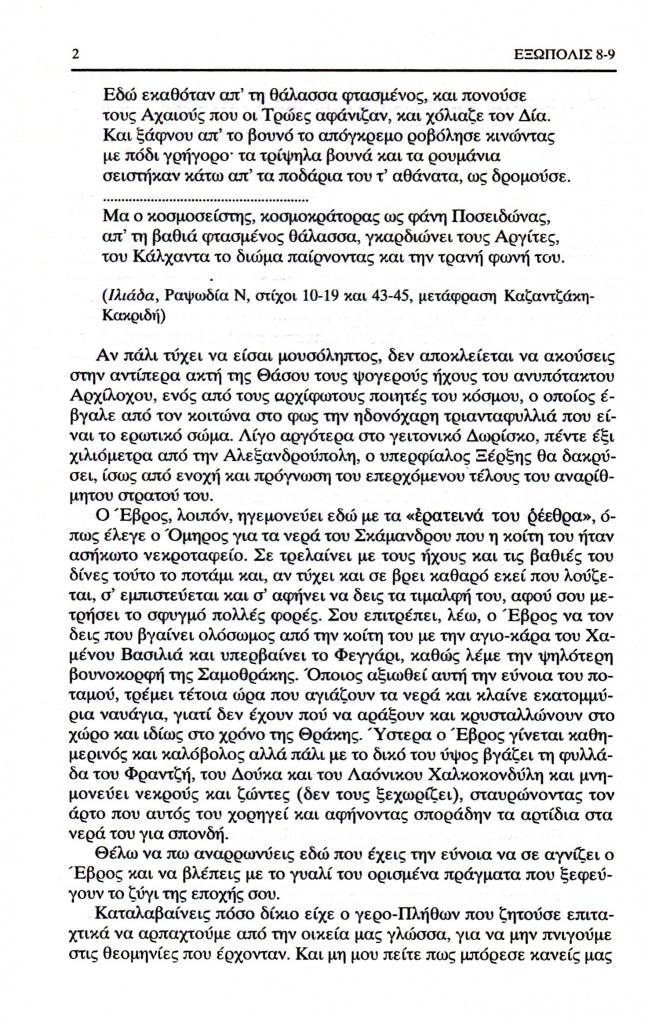 , «Η μυθολογία του Έβρου ή εκεί που η επίκουρος φύση αφθονεί και η φίλαυτη πολιτεία απουσιάζει», Εξώπολις, τχ. 8-9 (Χειμώνας 1998), σ. 1-4