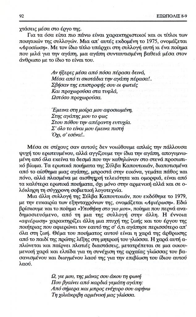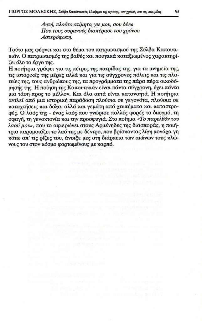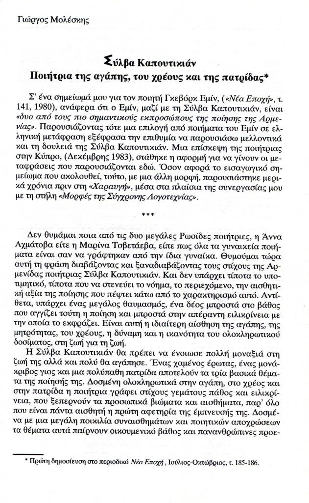 , «Σύλβα Καπουτικιάν. Ποιήτρια της αγάπης, του χρέους και της πατρίδας (Πρώτη δημοσίευση στο περ. Νέα Εποχή)», Εξώπολις, τχ. 8-9 (Χειμώνας 1998), σ. 91-93