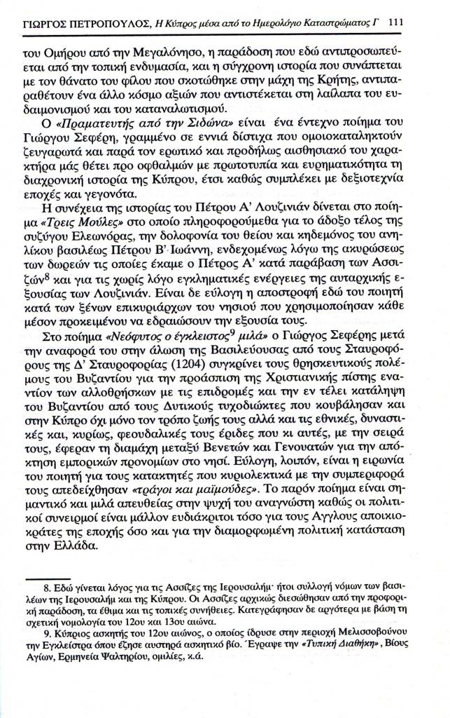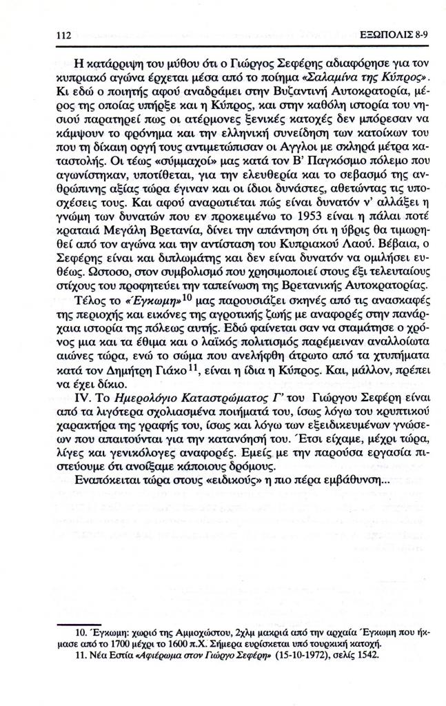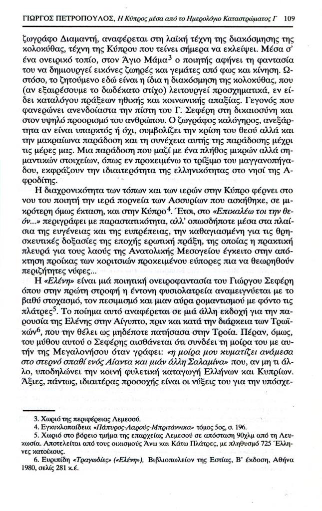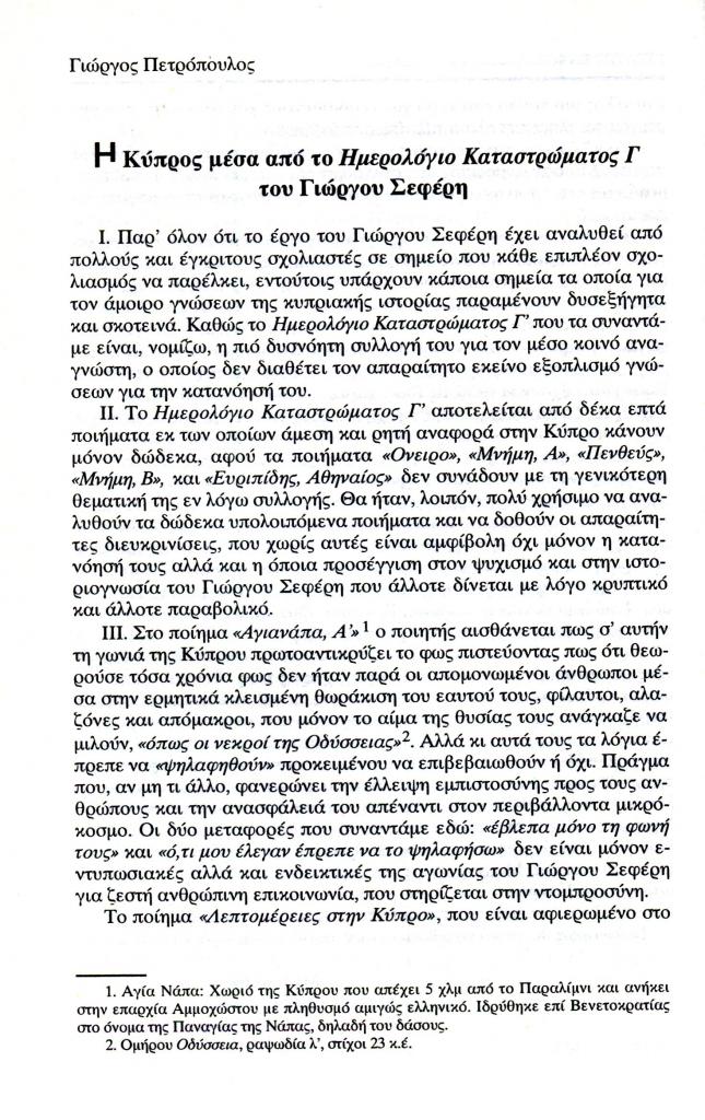 , «Η Κύπρος μέσα από το Ημερολόγιο Καταστρώματος Γ΄ του Γιώργου Σεφέρη», Εξώπολις, τχ. 8-9 (Χειμώνας 1998), σ. 108-112