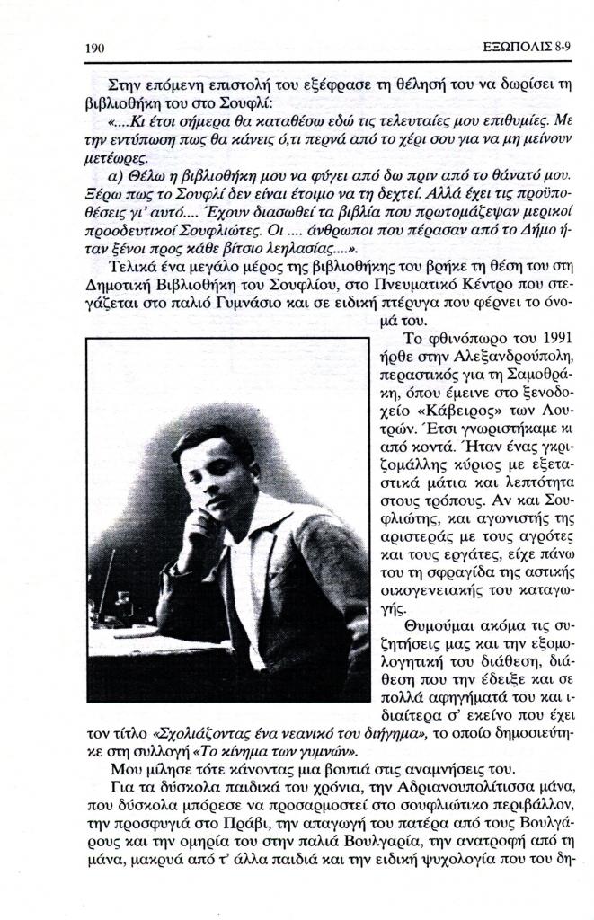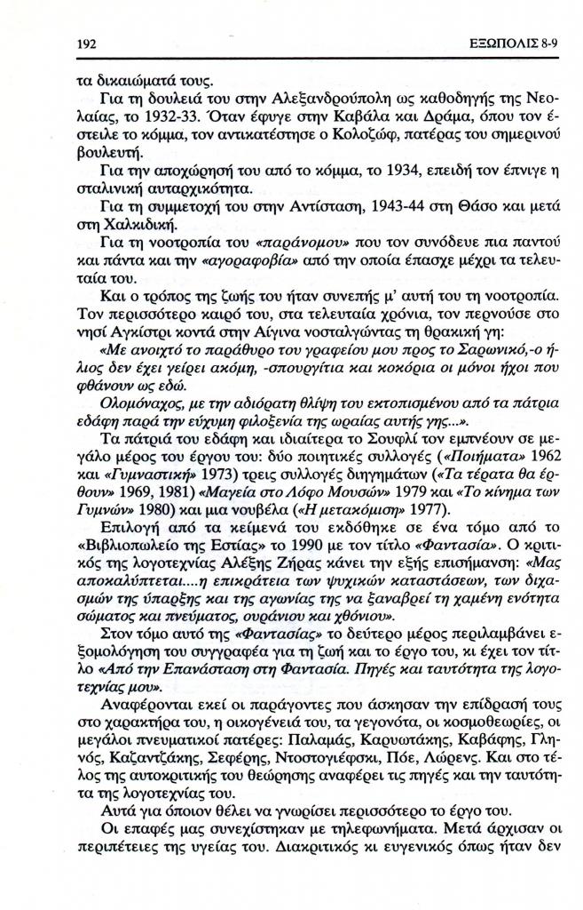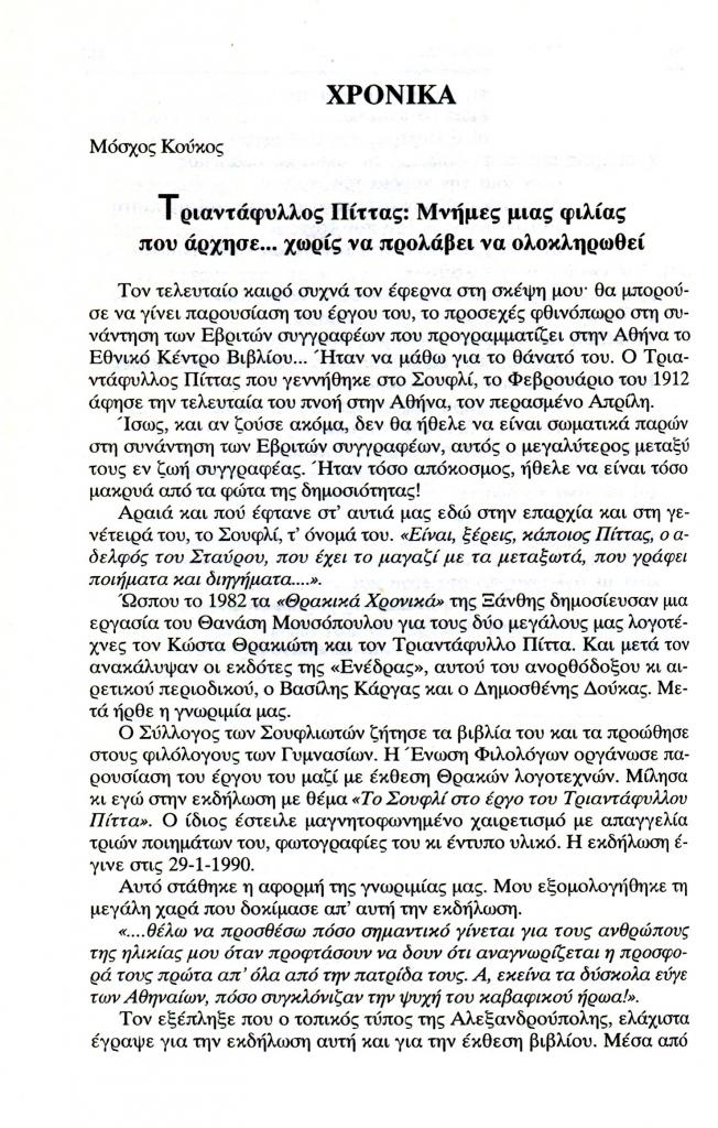 , «Τριαντάφυλλος Πίττας: Μνήμες μιας φιλίας που άρχησε... χωρίς να προλάβει να ολοκληρωθεί», Εξώπολις, τχ. 8-9 (Χειμώνας 1998), σ. 188-195