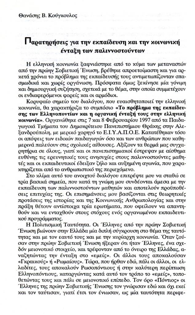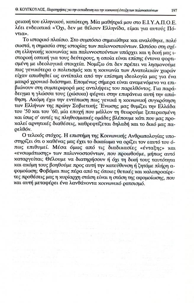Κούγκουλος Θανάσης Β., «Παρατηρήσεις για την εκπαίδευση και την κοινωνική ένταξη των παλιννοστούντων», Εξώπολις, τχ. 8-9 (Χειμώνας 1998), σ. 196-197