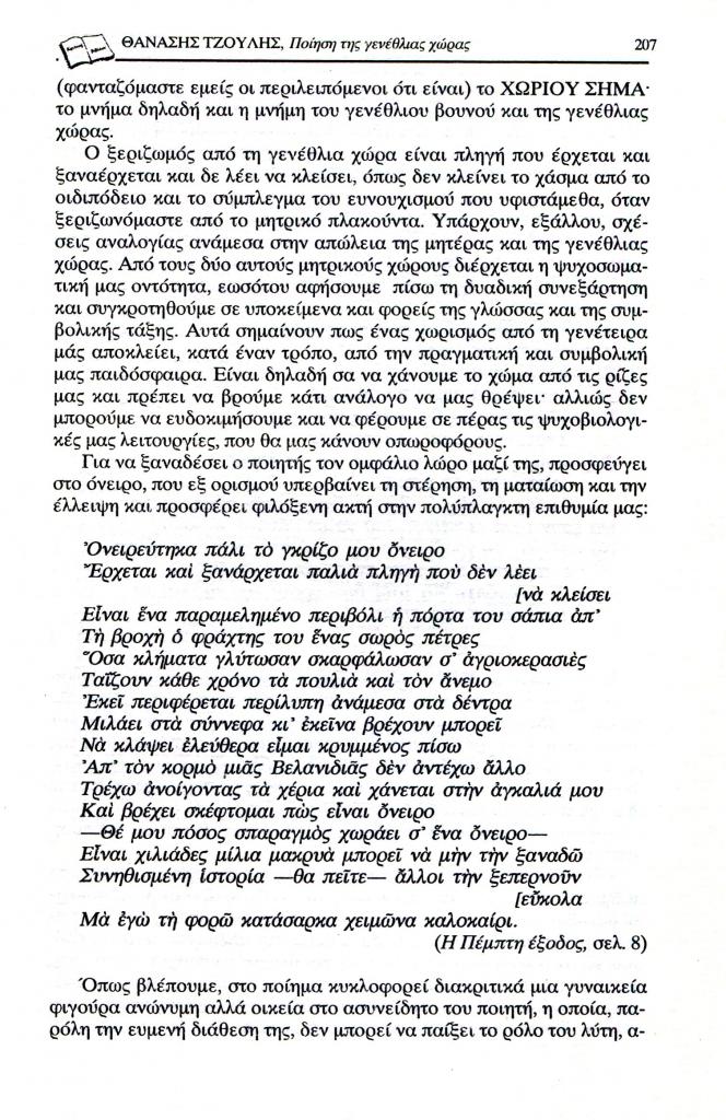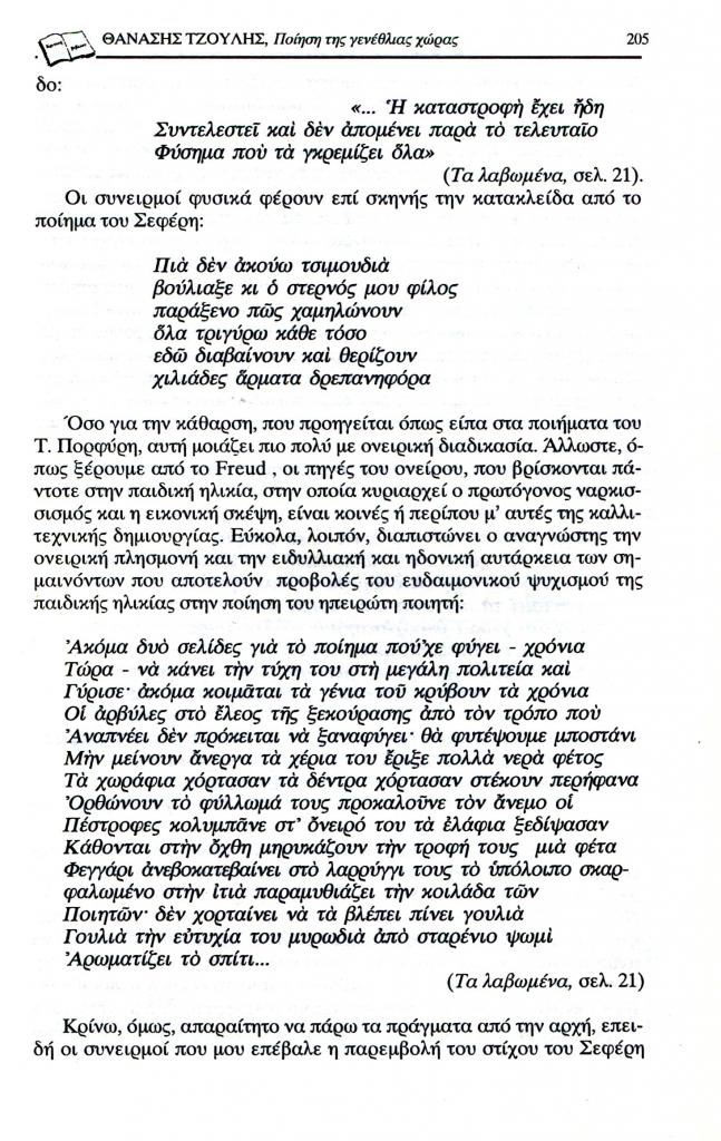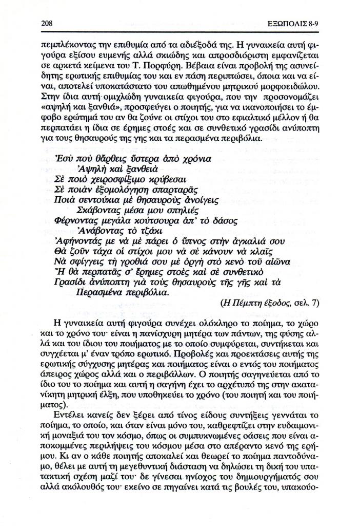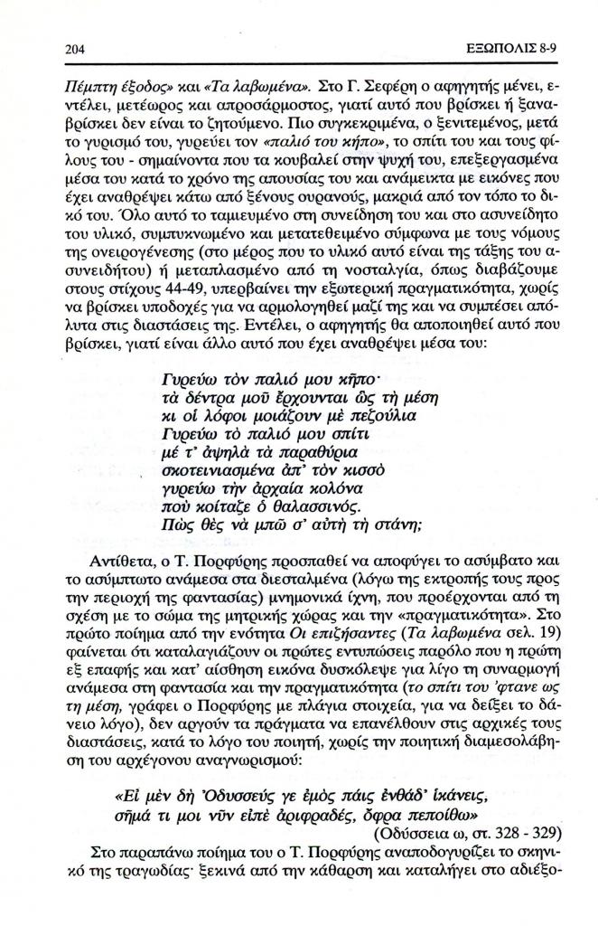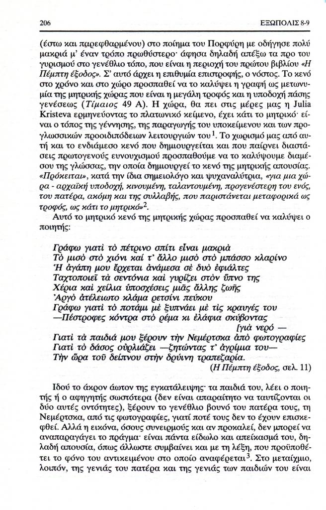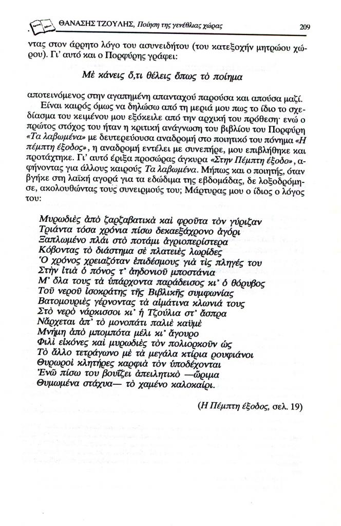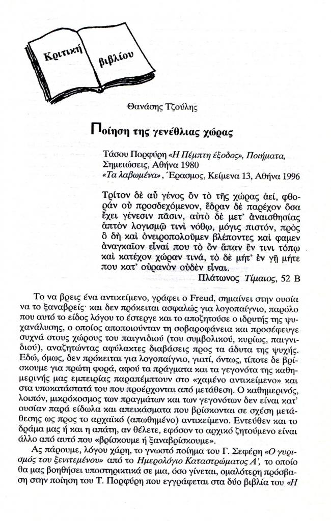 , «Ποίηση της γενέθλιας χώρας. Τάσου Πορφύρη Η Πέμπτη έξοδος, Ποιήματα, Σημειώσεις, Αθήνα 1980. Τα λαβωμένα, Έρασμος, Κείμενα 13, Αθήνα 1996», Εξώπολις, τχ. 8-9 (Χειμώνας 1998), σ. 203-209