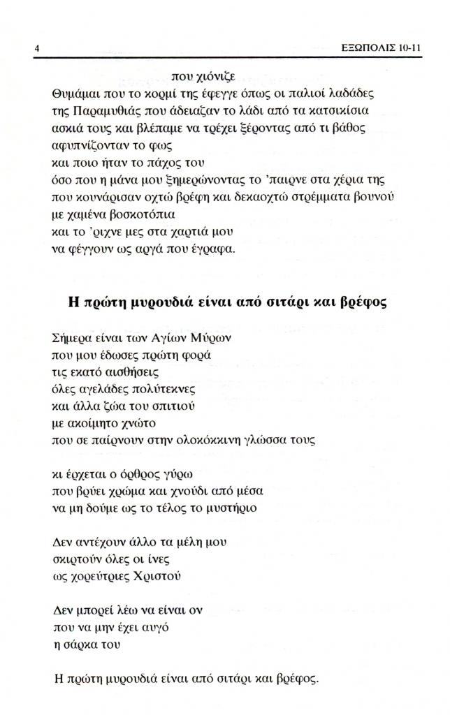 Τζούλης Θανάσης Χ., «Η πρώτη μυρουδιά είναι από σιτάρι και βρέφος», Εξώπολις, τχ. 10-11 (Χειμώνας-Άνοιξη 1999), σ. 4
