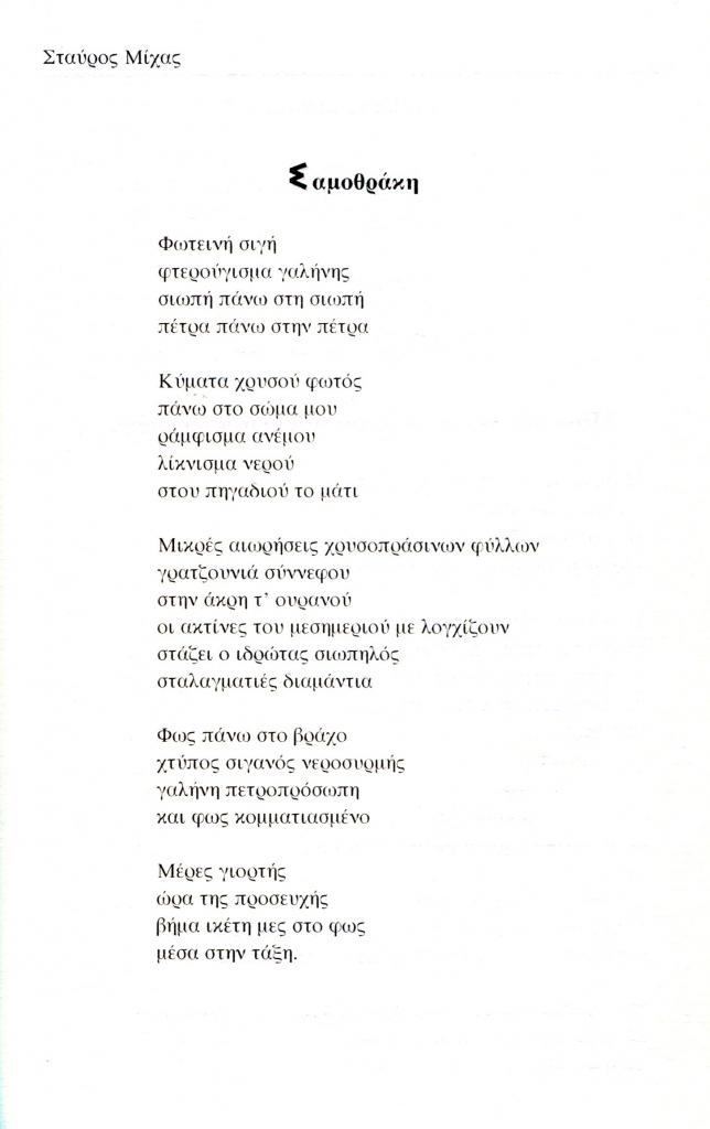 Μίχας Σταύρος, «Ποιήματα. Σαμοθράκη», Εξώπολις, τχ. 10-11 (Χειμώνας-Άνοιξη 1999), σ. 21