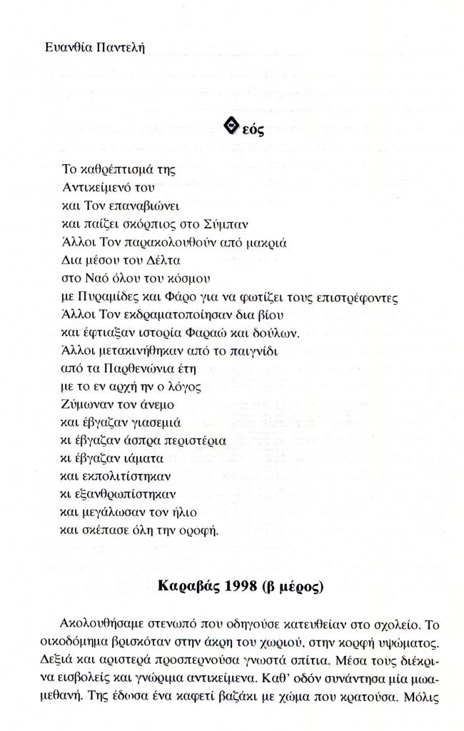 Παντελή Ευανθία, «Ποιήματα και Πεζά. Καραβάς 1998 (β μέρος)», Εξώπολις, τχ. 10-11 (Χειμώνας-Άνοιξη 1999), σ. 137-138