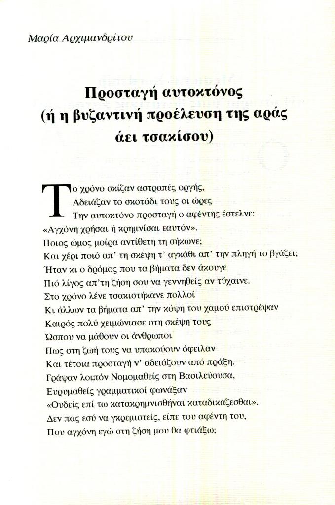 Αρχιμανδρίτου Μαρία, «Τρία ποιήματα. Προσταγή αυτοκτόνος (ή η βυζαντινή προέλαση της αράς άει τσακίσου)», Εξώπολις, τχ. 17 (Χειμώνας 2003), σ. 7