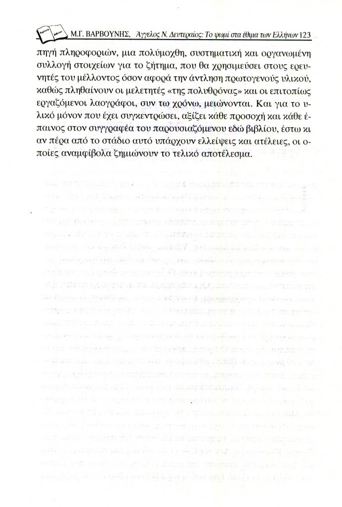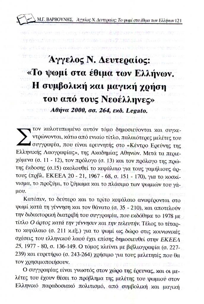 Βαρβούνης Μανόλης Γ., «Άγγελος Ν. Δευτεραίος: Το ψωμί στα έθιμα των Ελλήνων. Η συμβολική και μαγική χρήση του από τους Νεοέλληνες. Αθήνα 2000, σσ. 264, εκδ. Legato», Εξώπολις, τχ. 17 (Χειμώνας 2003), σ. 121-123