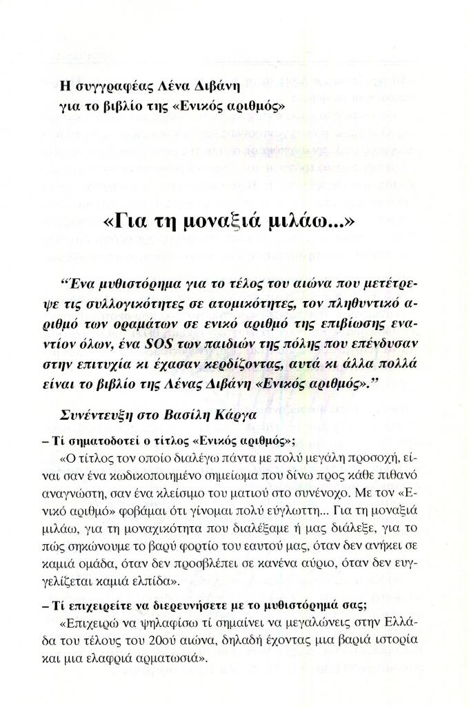 , «Η συγγραφέας Λένα Διβάνη για το βιβλίο της Ενικός αριθμός. Για τη μοναξιά μιλάω.... Συνέντευξη στο Βασίλη Κάργα», Εξώπολις, τχ. 19 (Φθινόπωρο 2004), σ. 17-19
