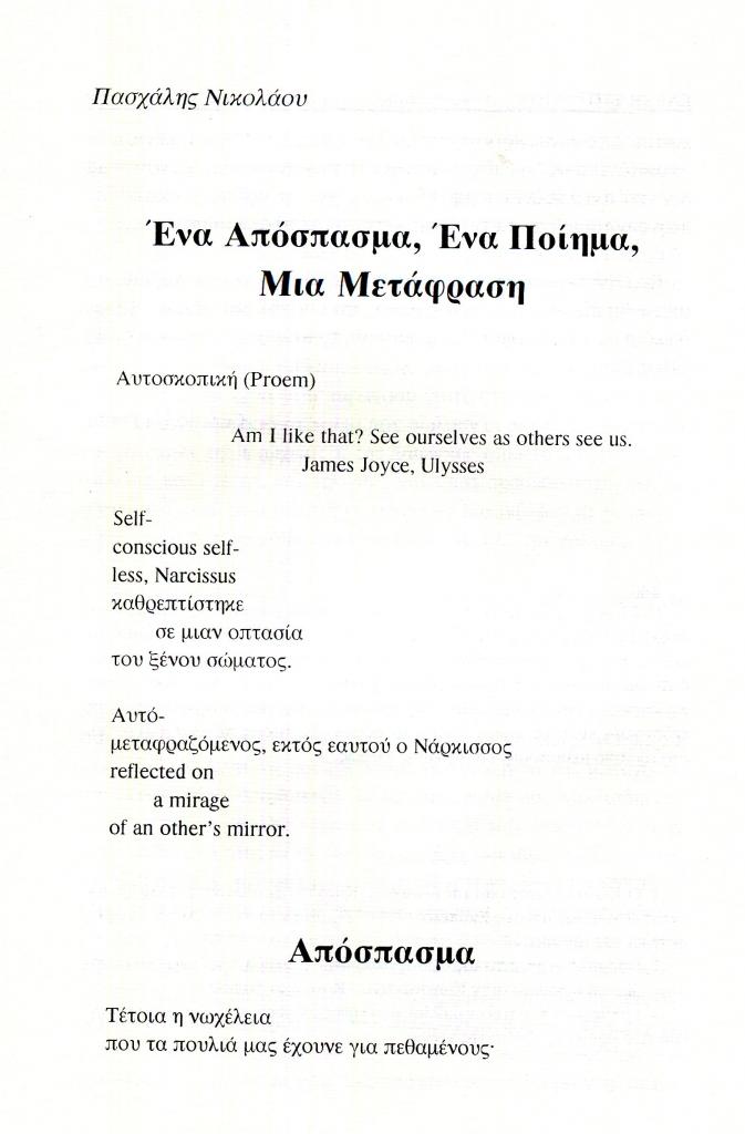 Νικολάου Πασχάλης, «Ένα απόσπασμα, ένα ποίημα, μια μετάφραση. Απόσπασμα», Εξώπολις, τχ. 19 (Φθινόπωρο 2004), σ. 66-67