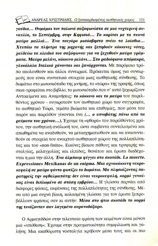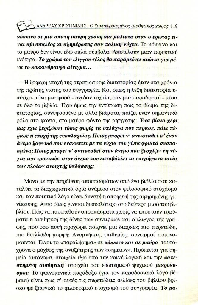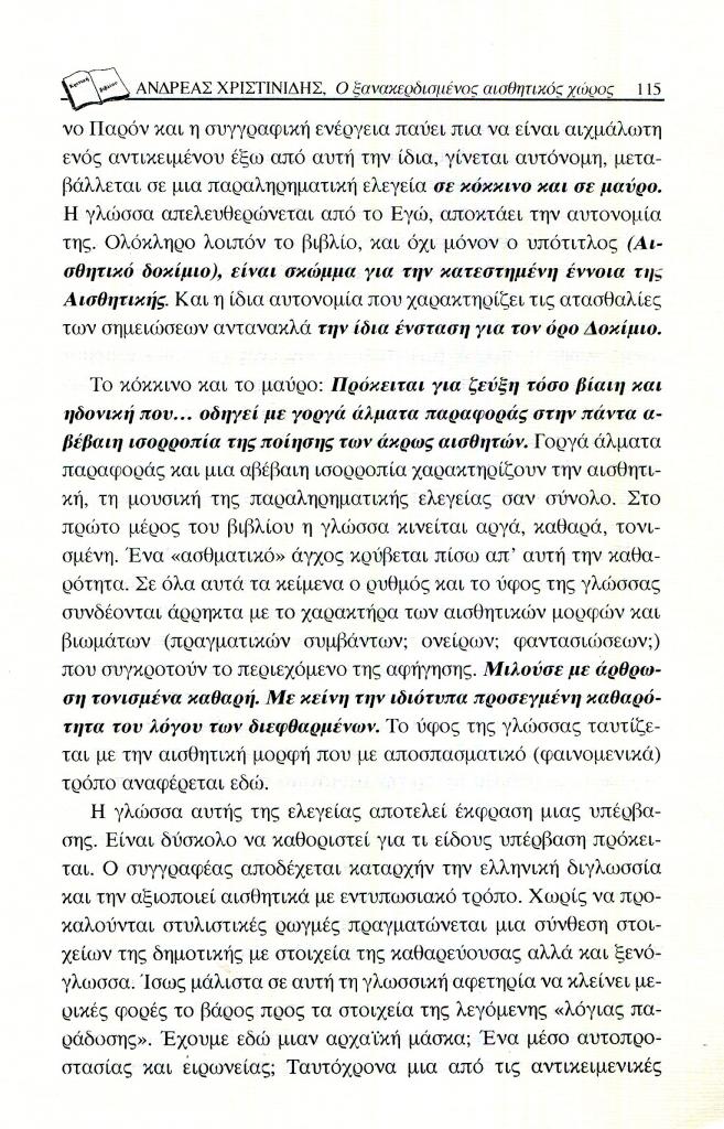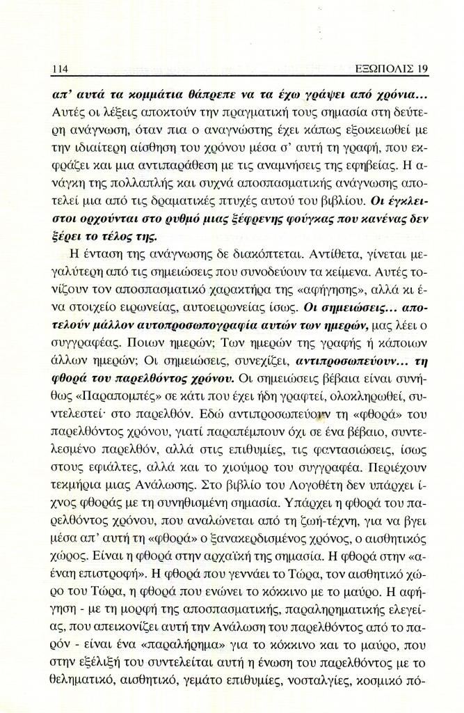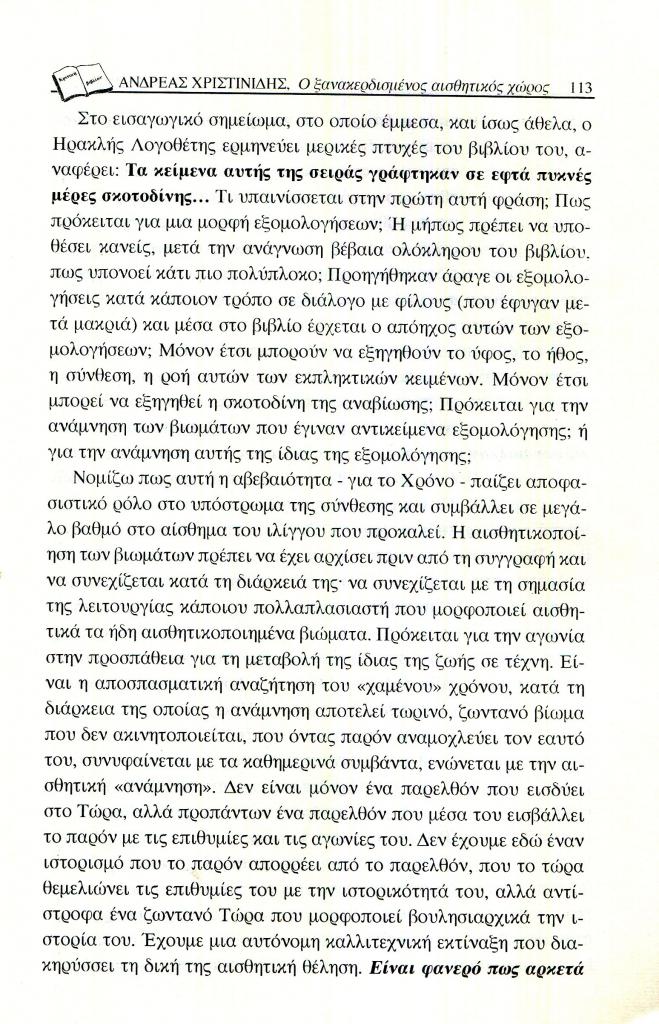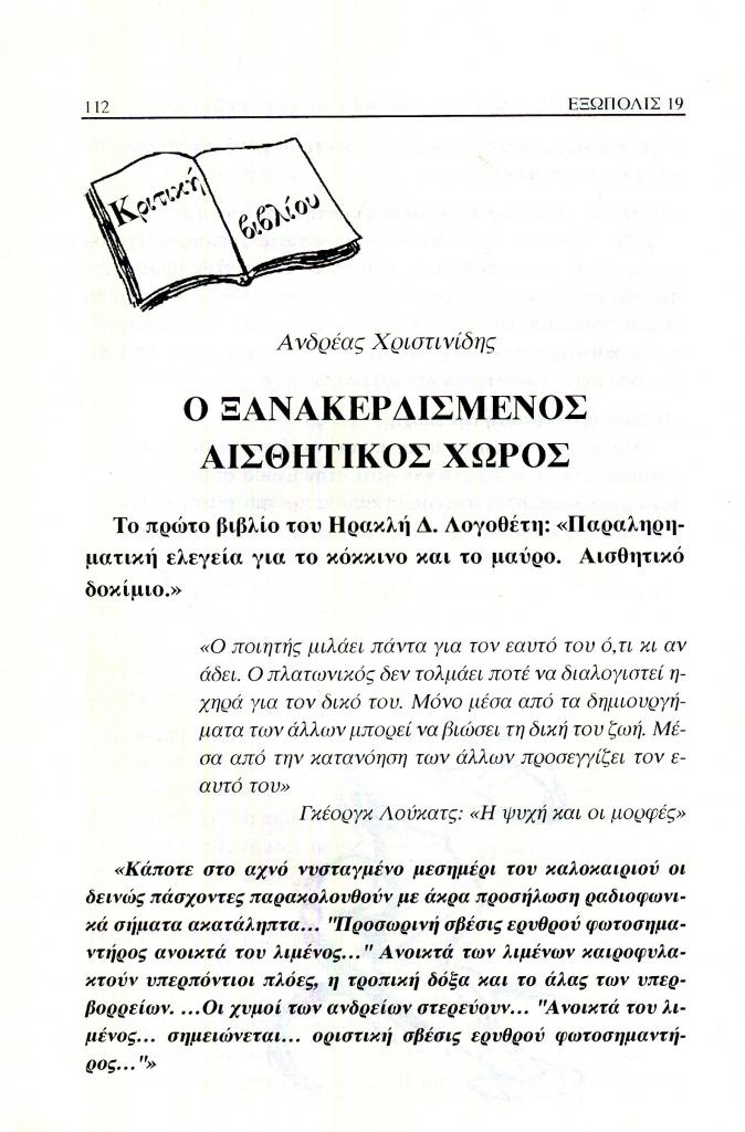 , «Ο ξανακερδισμένος αισθητικός χώρος. Το πρώτο βιβλίο του Ηρακλή Δ. Λογοθέτη: Παραληρηματική ελεγεία για το κόκκινο και μαύρο. Αισθητικό δοκίμιο», Εξώπολις, τχ. 19 (Φθινόπωρο 2004), σ. 112-123