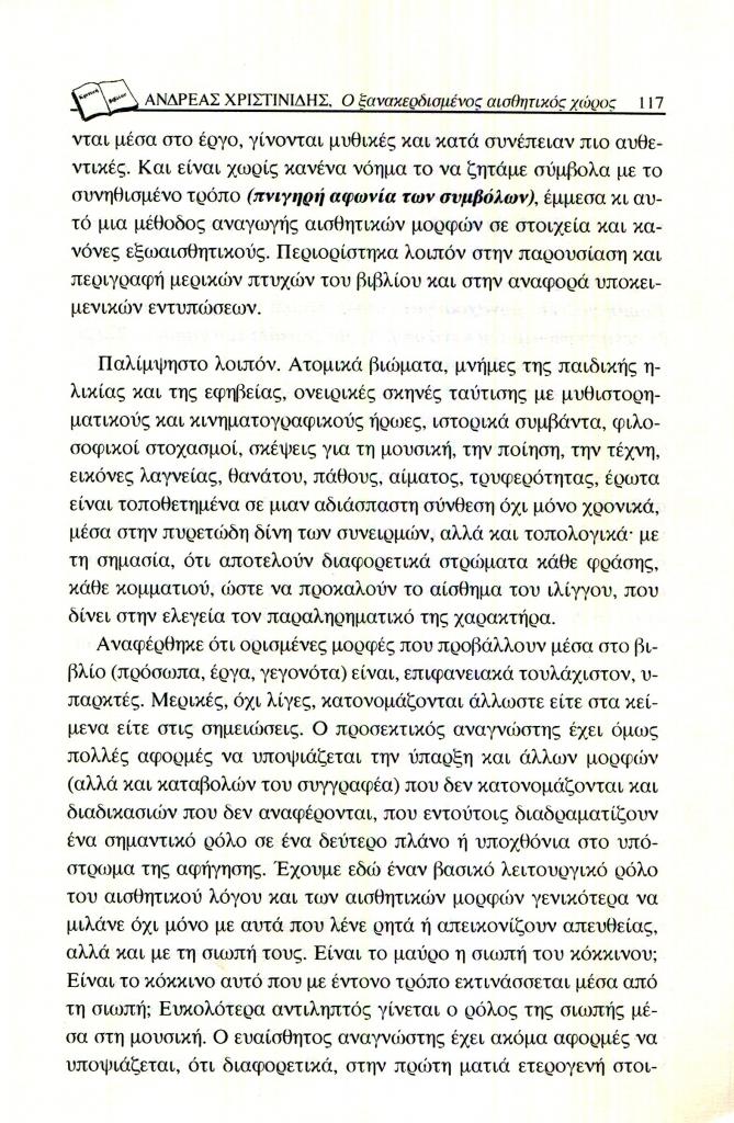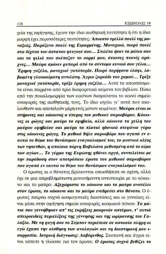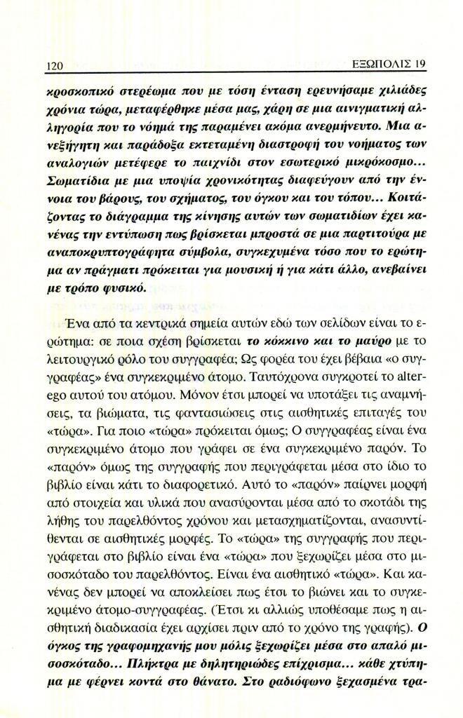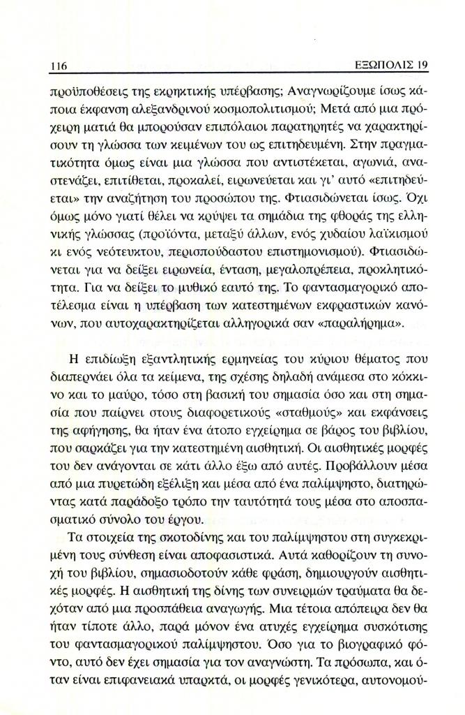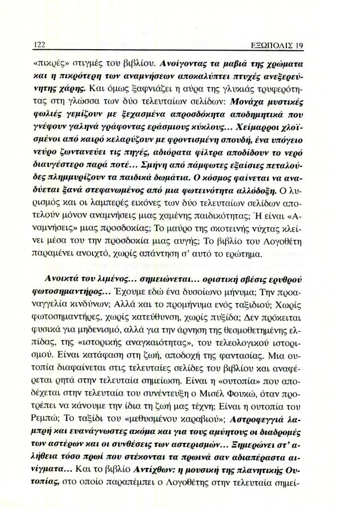 , «Ο ξανακερδισμένος αισθητικός χώρος. Το πρώτο βιβλίο του Ηρακλή Δ. Λογοθέτη: Παραληρηματική ελεγεία για το κόκκινο και μαύρο. Αισθητικό δοκίμιο», Εξώπολις, τχ. 19 (Φθινόπωρο 2004), σ. 112-123
