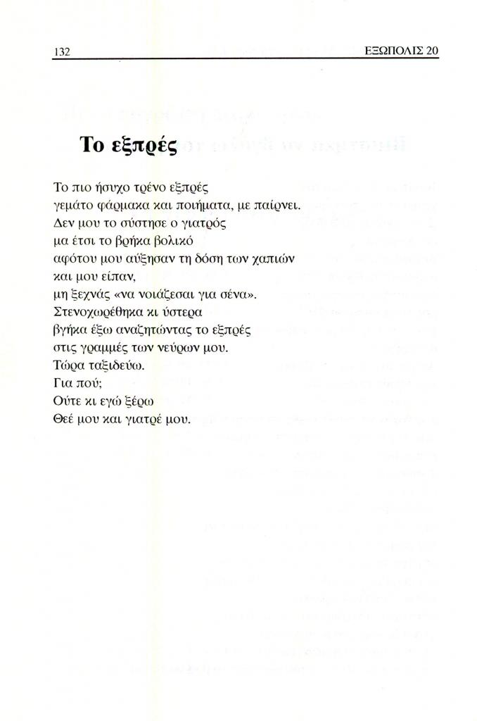 , «Μια υπογραφή παρα πάνω. Το εξπρές (Προδημοσίευση από την ποιητική συλλογή Μια υπογραφή παραπάνω)», Εξώπολις, τχ. 20 (Άνοιξη 2006), σ. 132