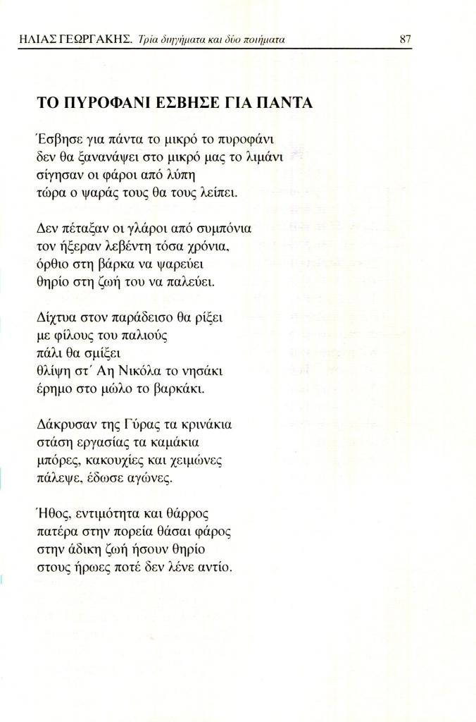 Γεωργάκης Ηλίας Π., «Τρία διηγήματα και δύο ποιήματα. Το πυροφάνι έσβησε για πάντα», Εξώπολις, τχ. 22 (Δεκέμβρης 2008), σ. 87