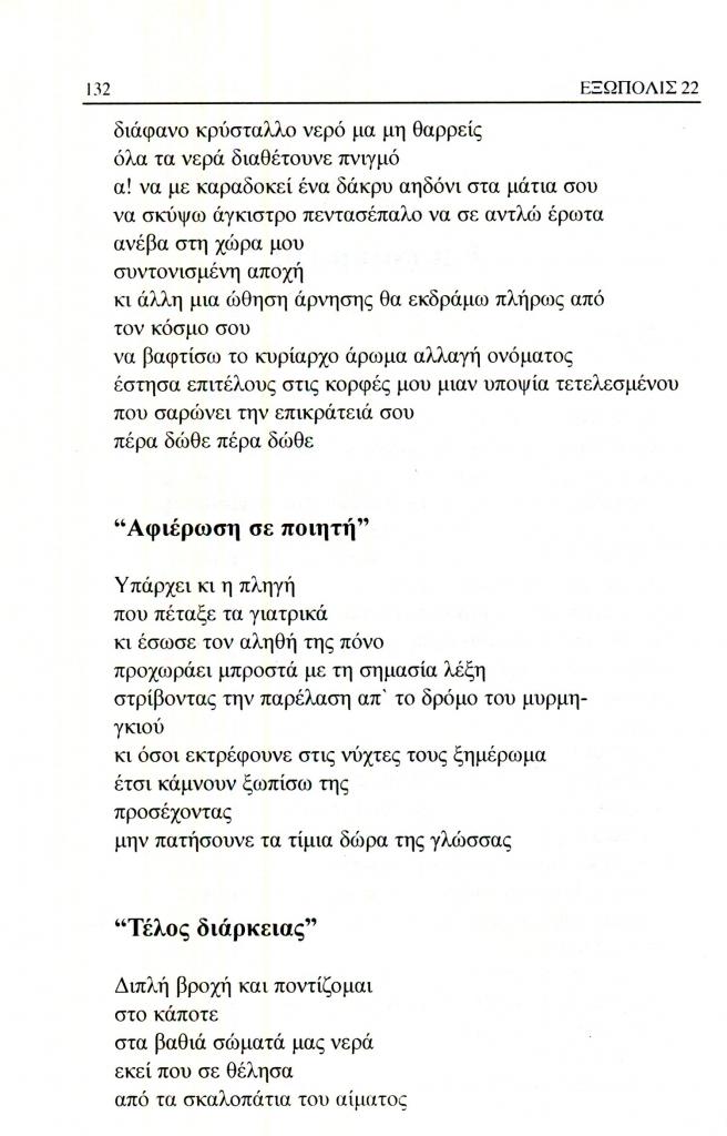 Ξένος Σωκράτης, «Έξι ποιήματα. Αφιέρωση σε ποιητή (Από τη συλλογή Σημύδες)», Εξώπολις, τχ. 22 (Δεκέμβρης 2008), σ. 132
