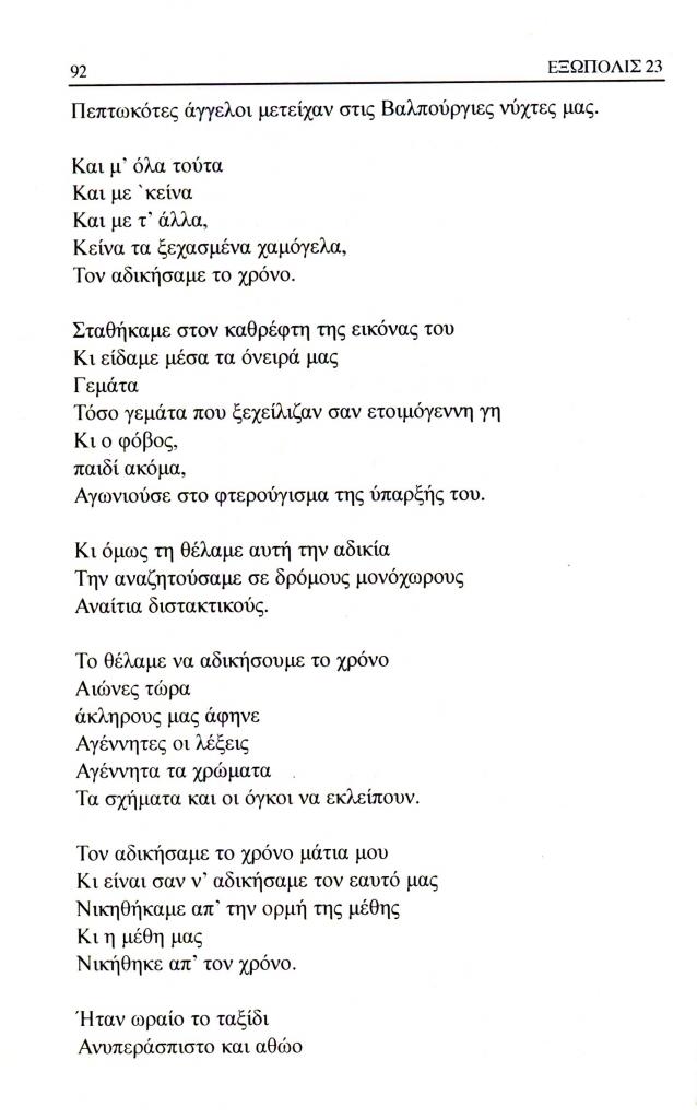 , «Μεταδεδομένα. Τον αδικήσαμε το χρόνο μάτια μου (Από την ανέκδοτη συλλογή 23 Μοτέτα και μία Φούγκα)», Εξώπολις, τχ. 23 (Χειμώνας 2010), σ. 91-93