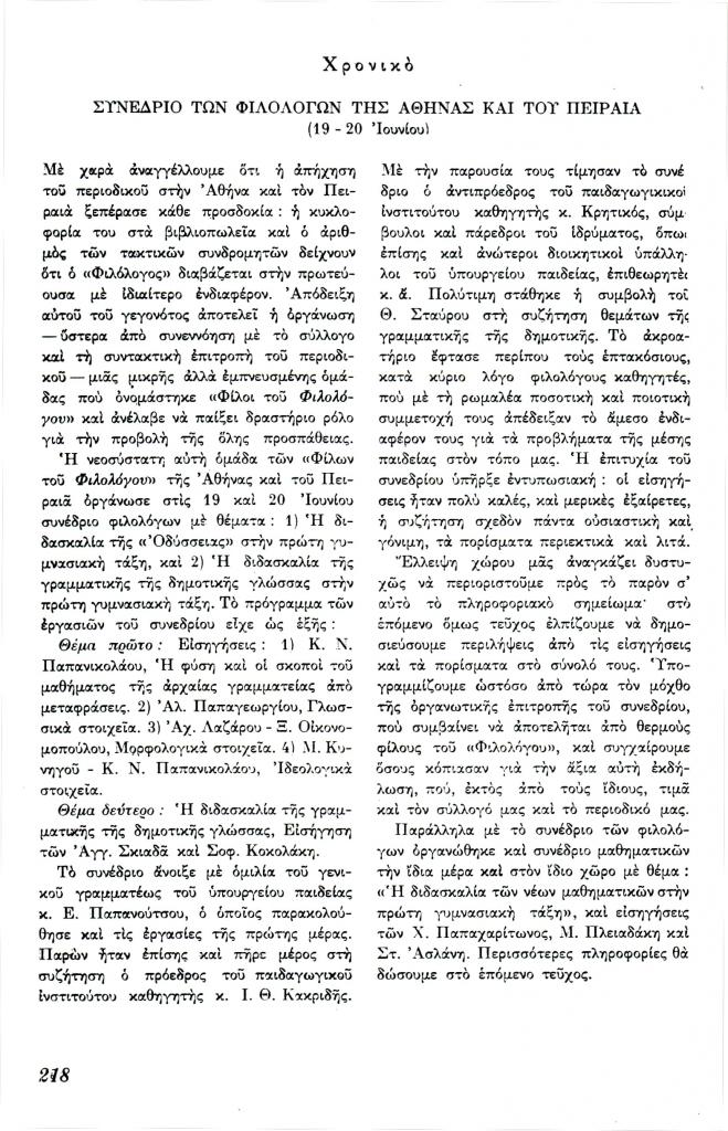 , «Χρονικό. Συνέδριο των φιλολόγων της Αθήνας και του Πειραιά (19-20 Ιουνίου)», Φιλόλογος, τχ. 4 (Ιούνιος 1965), σ. 218