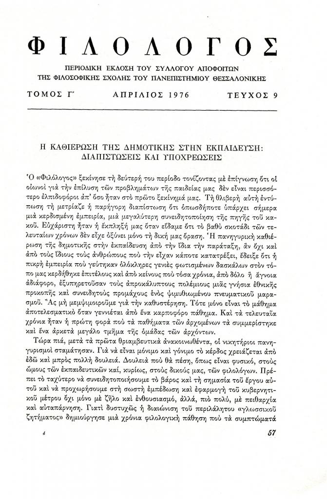 (ανυπόγραφο), «Σημειώματα. Η καθιέρωση της δημοτικής στην εκπαίδευση: Διαπιστώσεις και υποχρεώσεις», Φιλόλογος, τχ. 9 (Απρίλιος 1976), σ. 57-58