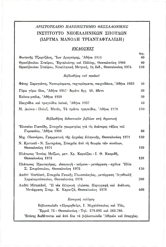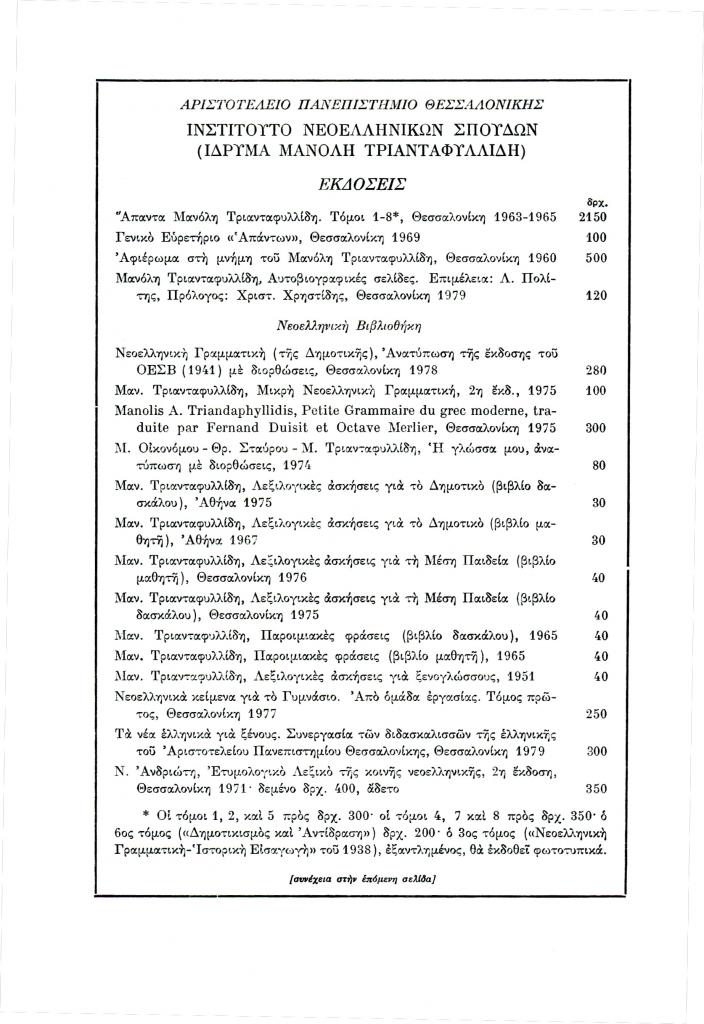 «Αριστοτέλειο Πανεπιστήμιο Θεσσαλονίκης. Ινστιτούτο Νεοελληνικών Σπουδών (Ίδρυμα Μανόλη Τριανταφυλλίδη). Εκδόσεις», Φιλόλογος, τχ. 17 (Σεπτέμβριος 1979), σ. 194-196