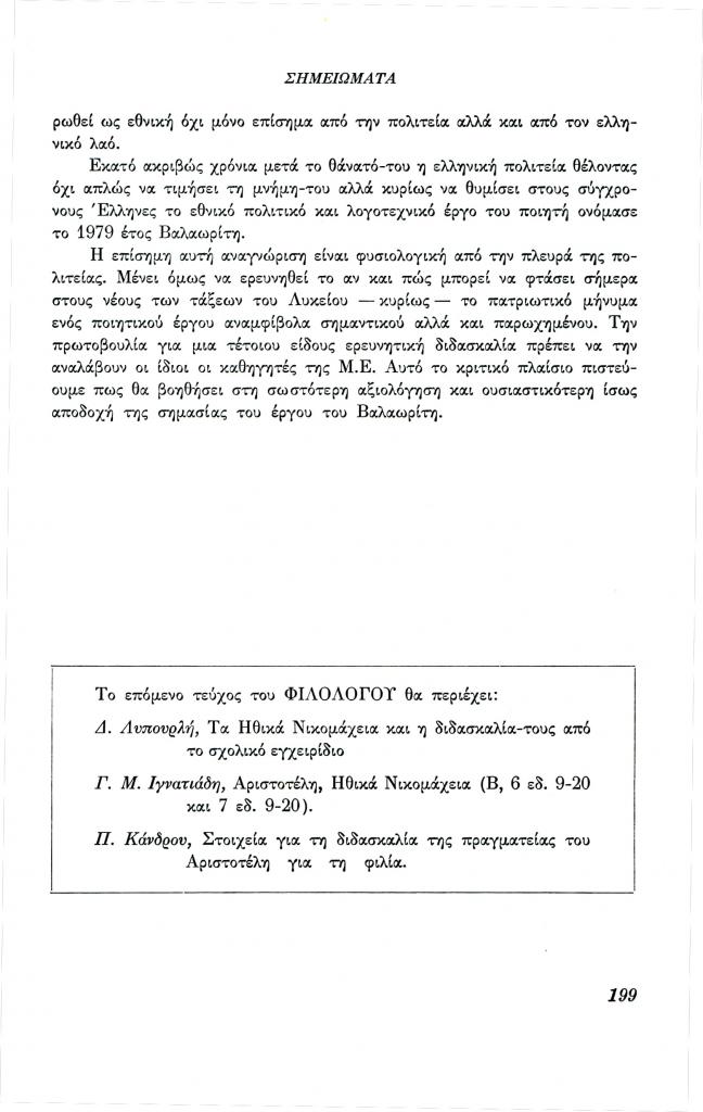 (ανυπόγραφο), «Σημειώματα. 1979: Έτος Αριστοτέλη Βαλαωρίτη», Φιλόλογος, τχ. 18 (Δεκέμβριος 1979), σ. 198-199