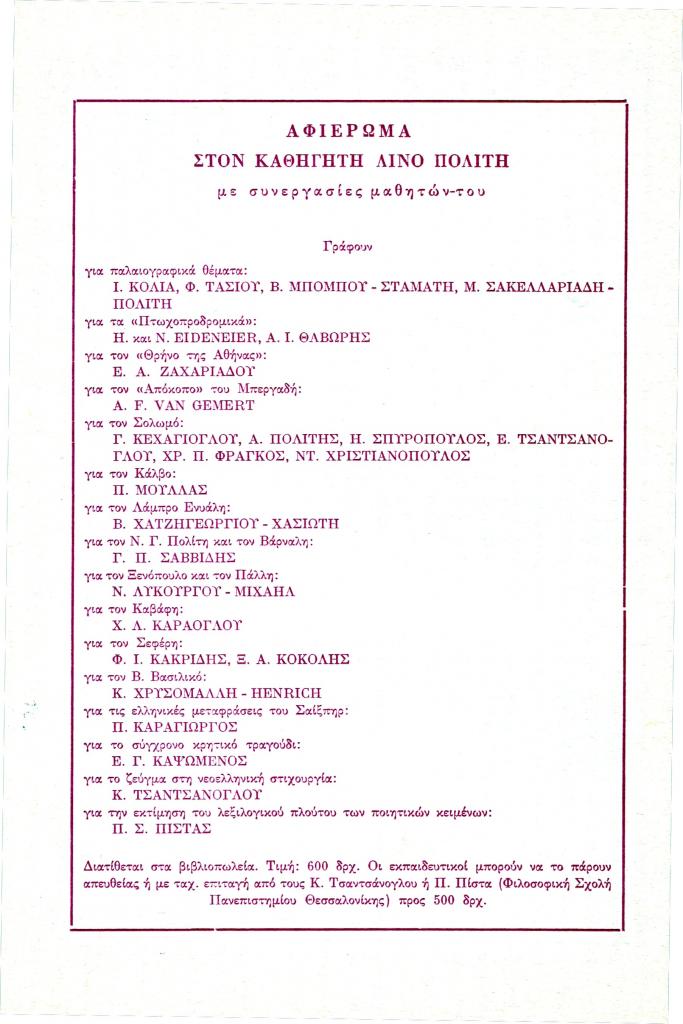 «Αφιέρωμα στον καθηγητή Λίνο Πολίτη με συνεργασίες μαθητών του», Φιλόλογος, τχ. 18 (Δεκέμβριος 1979), σ. (οπισθόφυλλο)