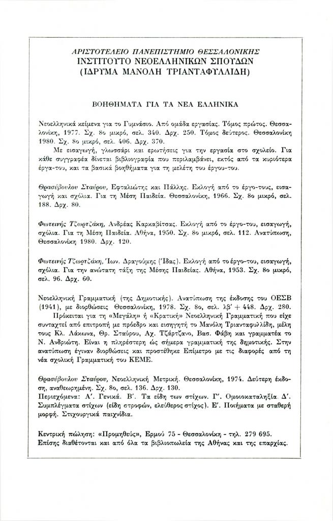 «Αριστοτέλειο Πανεπιστήμιο Θεσσαλονίκης. Ινστιτούτο Νεοελληνικών Σπουδών (Ίδρυμα Μανόλη Τριανταφυλλίδη). Βοηθήματα για τα νέα ελληνικά», Φιλόλογος, τχ. 33 (Φθινόπωρο 1983), σ. 250