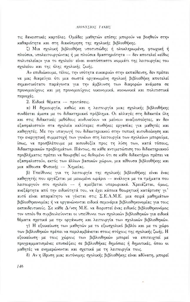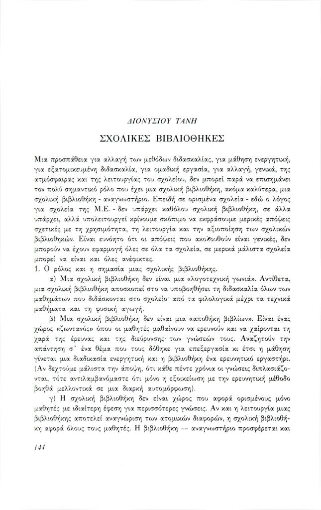 Τάνης Διονύσιος Ορ., «Σχολικές βιβλιοθήκες», Φιλόλογος, τχ. 36 (Καλοκαίρι 1984), σ. 144-147