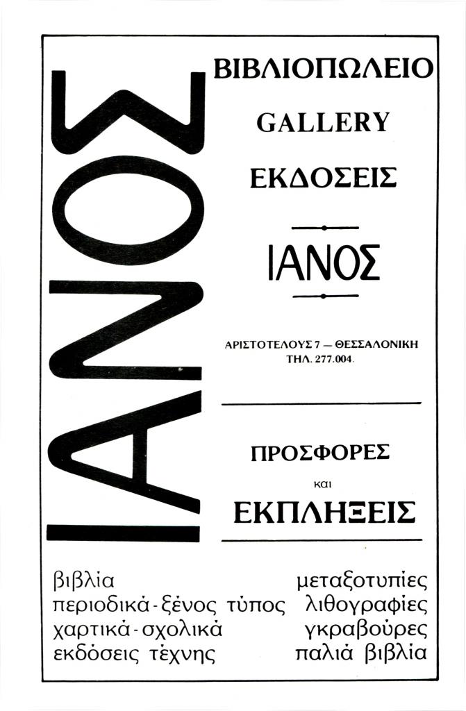 «Βιβλιοπωλείο Gallery Εκδόσεις Ιανός», Φιλόλογος, τχ. 38 (Χειμώνας 1984), σ. (οπισθόφυλλο)