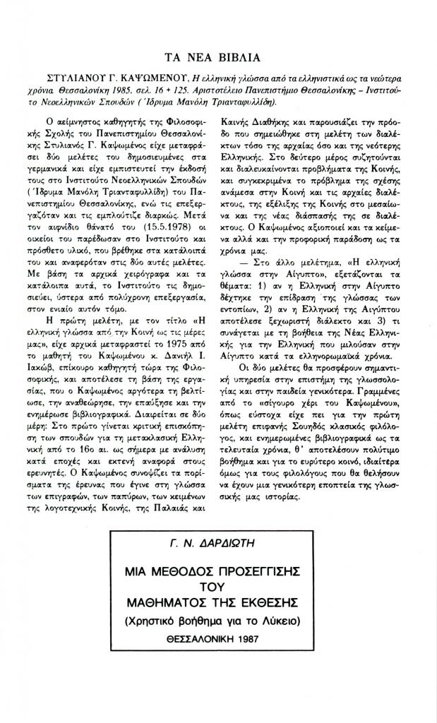 (ανυπόγραφο), «Τα νέα βιβλία», Φιλόλογος, τχ. 48 (Καλοκαίρι 1987), σ. 176