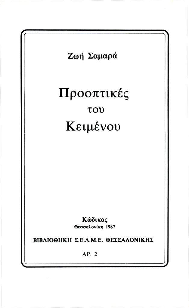 «Ζωή Σαμαρά Προοπτικές του κειμένου Κώδικας Θεσσαλονίκη 1987. Βιβλιοθήκη Σ.Ε.Λ.Μ.Ε. Θεσσαλονίκης Αρ. 2», Φιλόλογος, τχ. 50 (Χειμώνας 1987), σ. 352