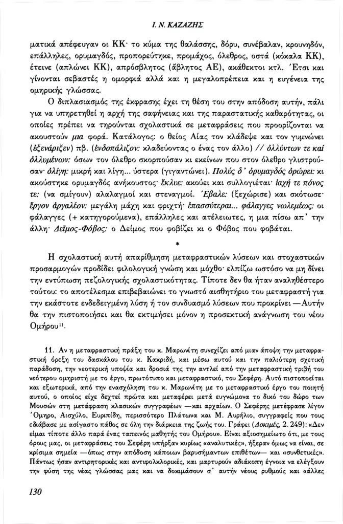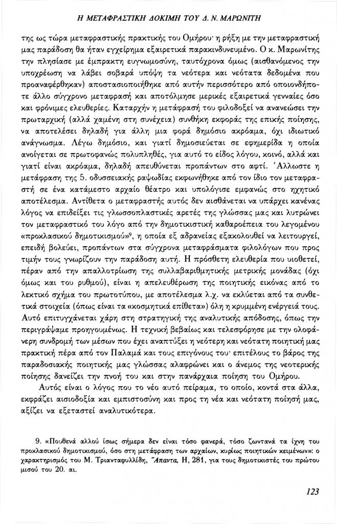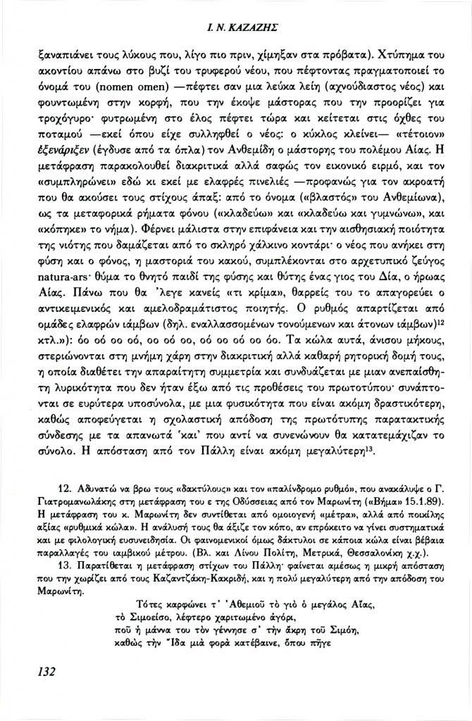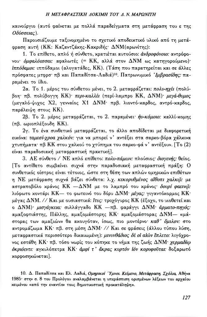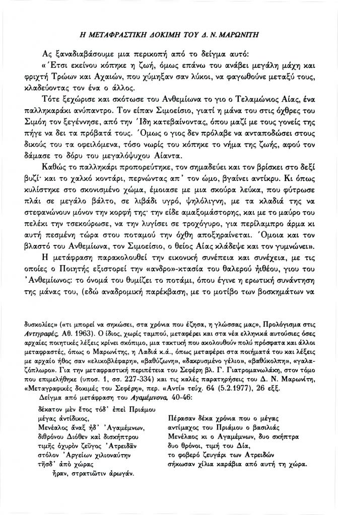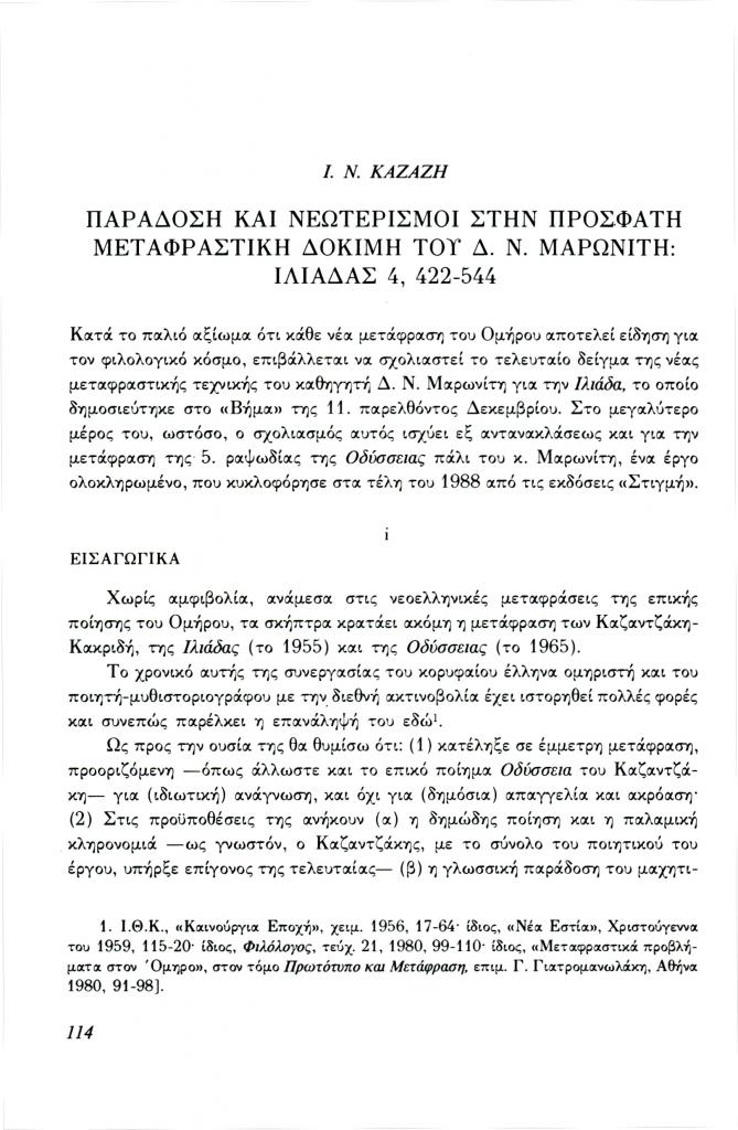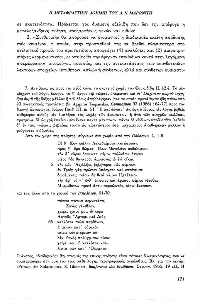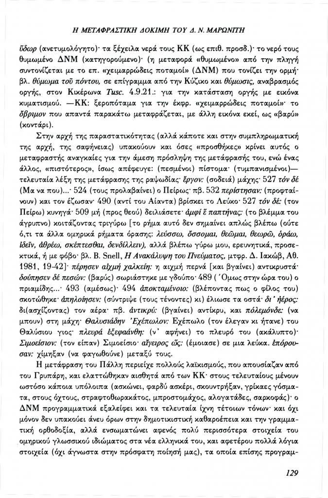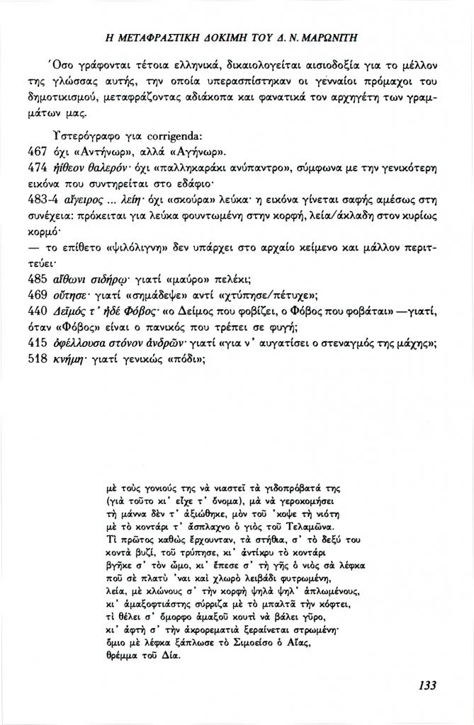 , «Παράδοση και νεωτερισμοί στην πρόσφατη μεταφραστική δοκιμή του Δ.Ν. Μαρωνίτη: Ιλιάδας 4, 422-544», Φιλόλογος, τχ. 56 (Καλοκαίρι 1989), σ. 114-133