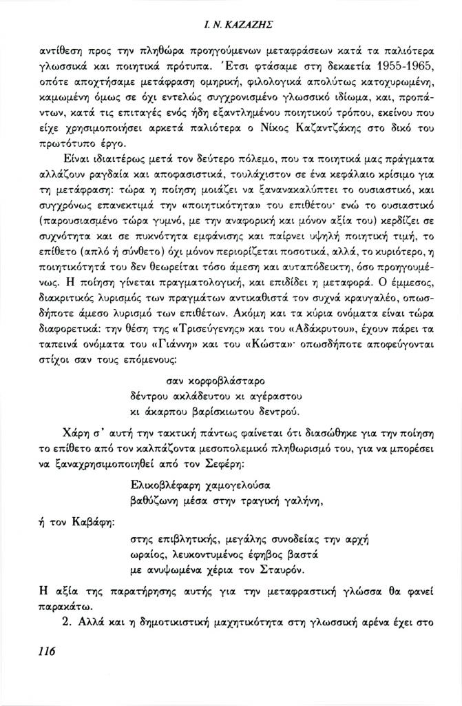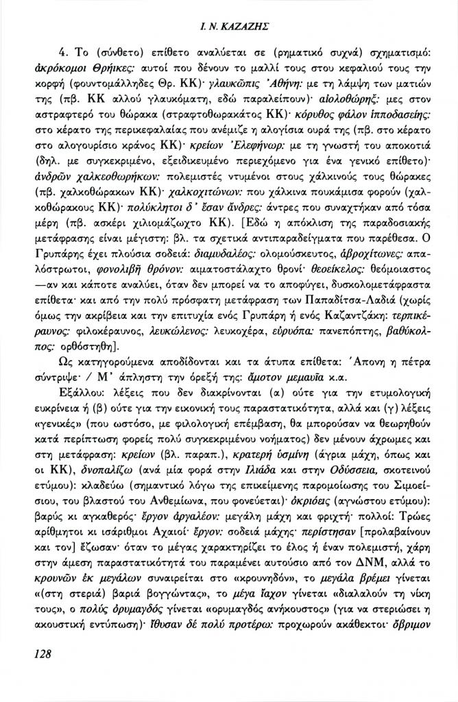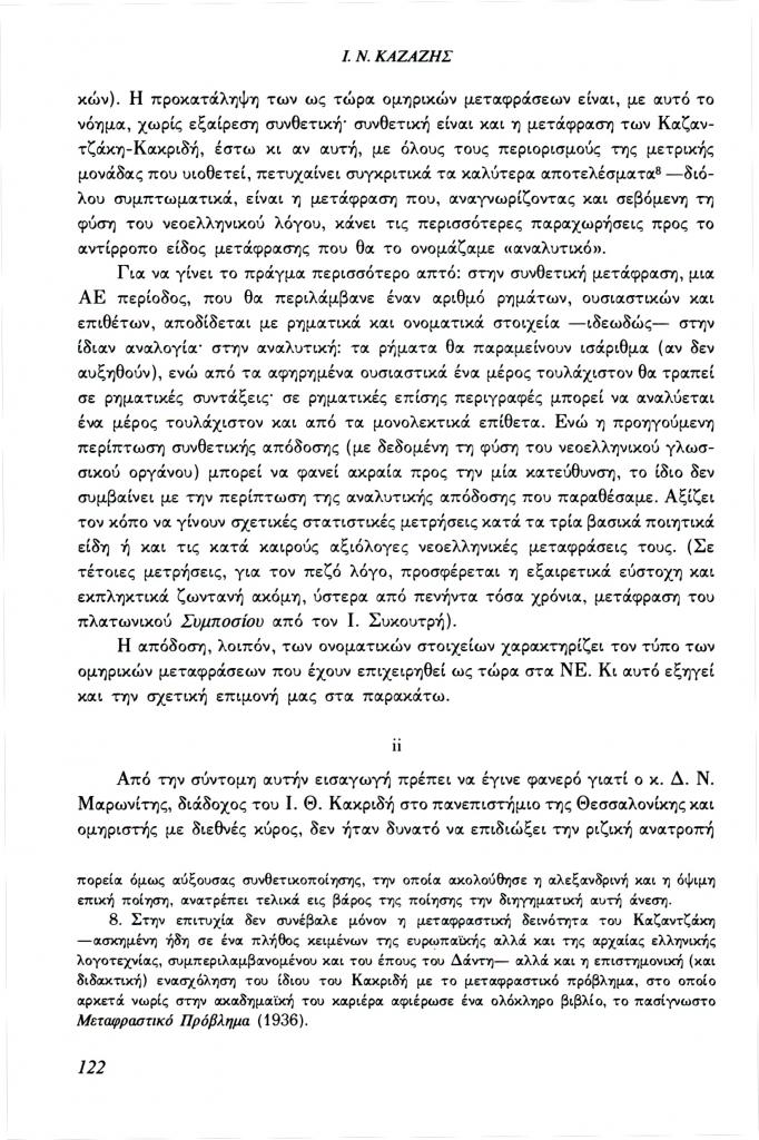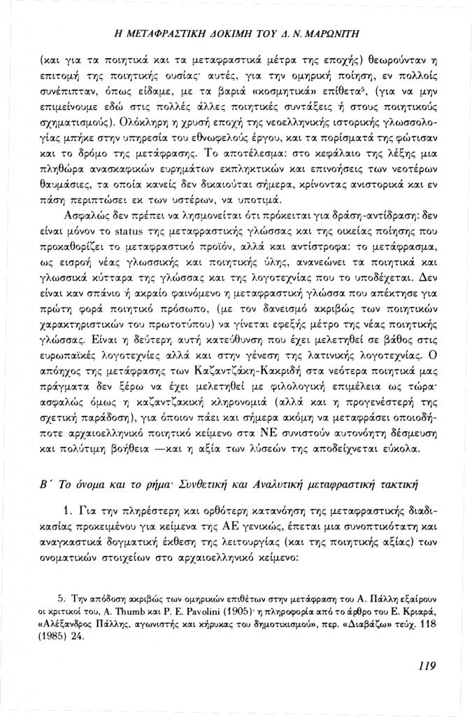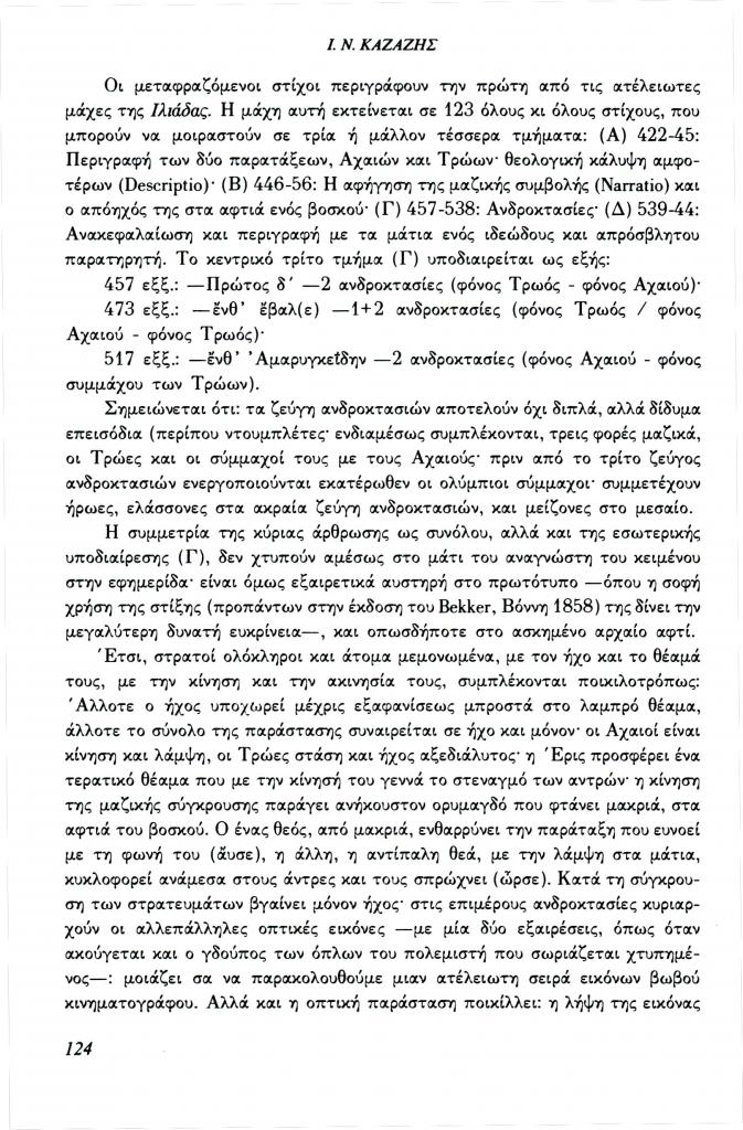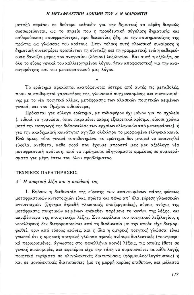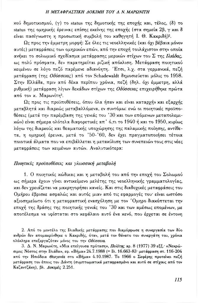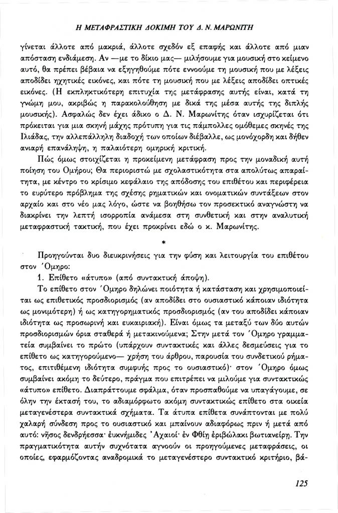 , «Παράδοση και νεωτερισμοί στην πρόσφατη μεταφραστική δοκιμή του Δ.Ν. Μαρωνίτη: Ιλιάδας 4, 422-544», Φιλόλογος, τχ. 56 (Καλοκαίρι 1989), σ. 114-133