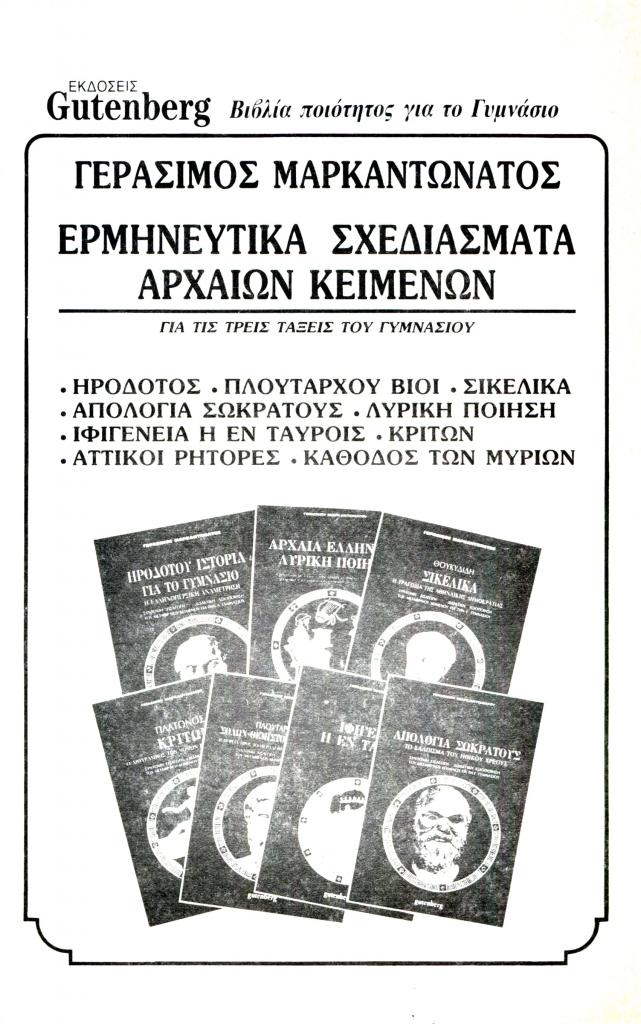 «Γεράσιμος Μαρκαντωνάτος Ερμηνευτικά σχεδιάσματα αρχαίων κειμένων για τις τρεις τάξεις του Γυμνασίου», Φιλόλογος, τχ. 57 (Φθινόπωρο 1989), σ. (έσω οπισθόφυλλο)