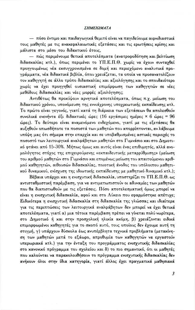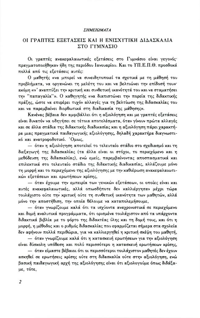 (ανυπόγραφο), «Σημειώματα. Οι γραπτές εξετάσεις και η ενισχυτική διδασκαλία στο Γυμνάσιο», Φιλόλογος, τχ. 67 (Άνοιξη 1992), σ. 2-4