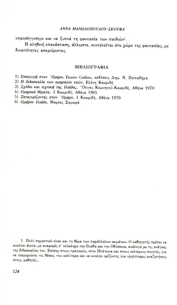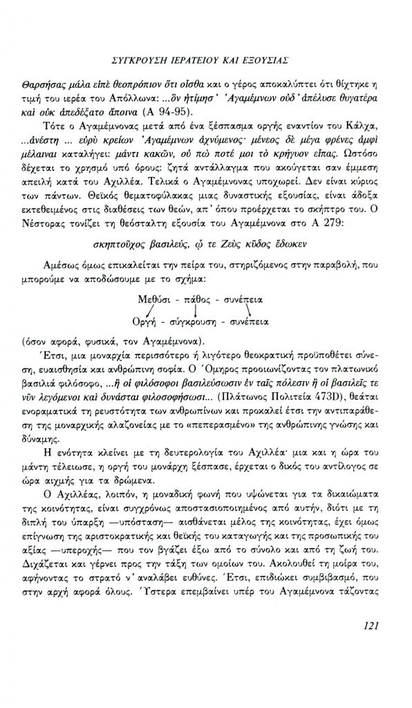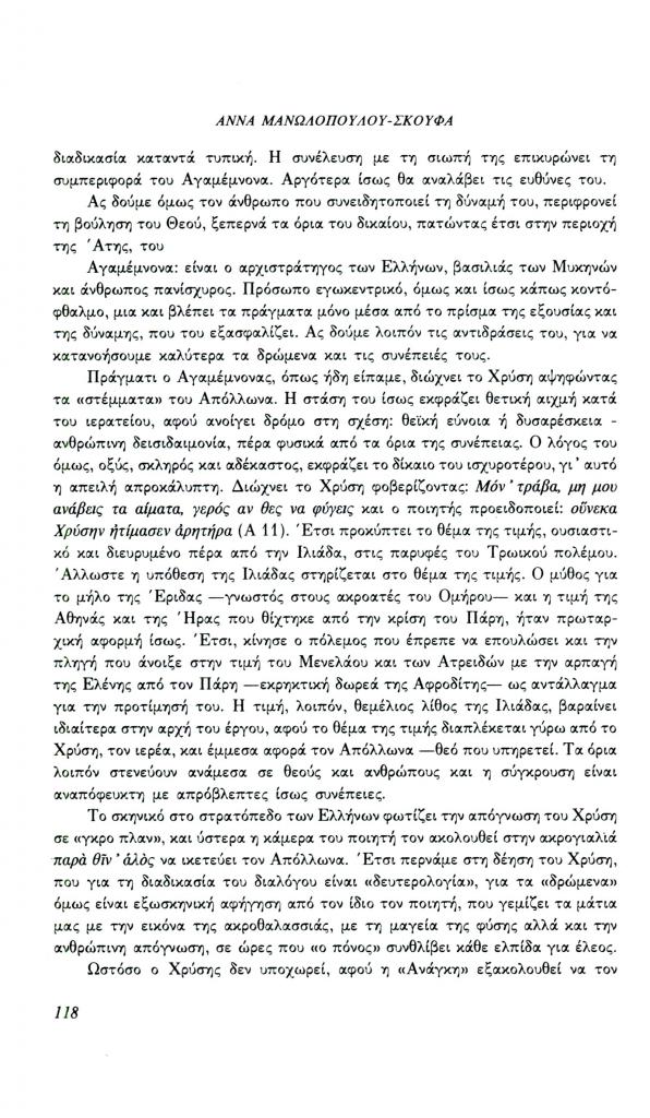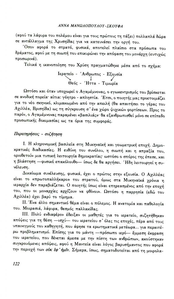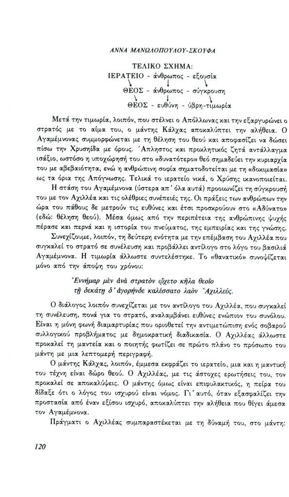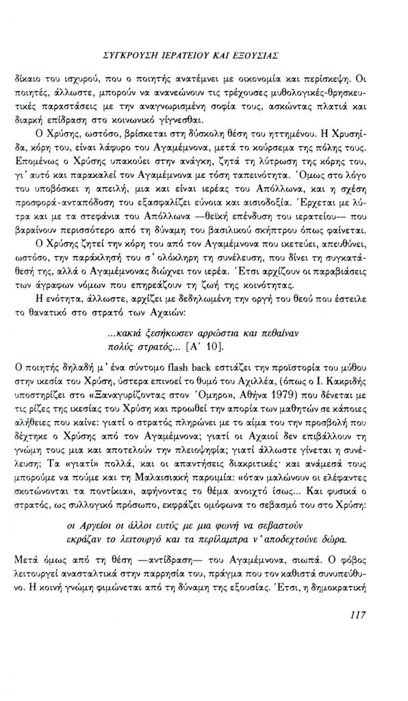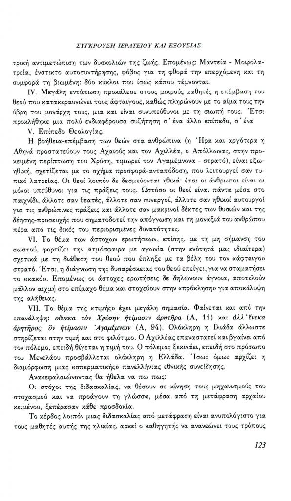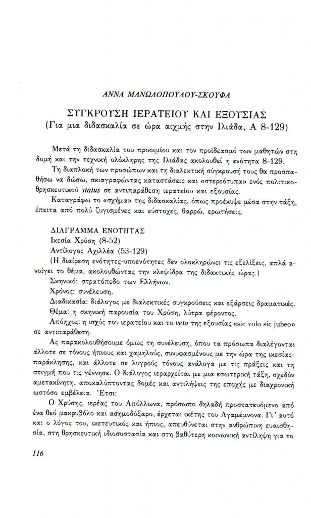 , «Σύγκρουση ιερατείου και εξουσίας (Για μια διδασκαλία σε ώρα αιχμής στην Ιλιάδα, Α 8-129)», Φιλόλογος, τχ. 68 (Καλοκαίρι 1992), σ. 116-124
