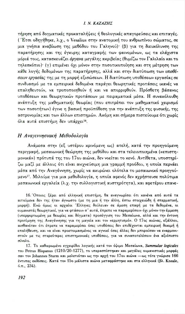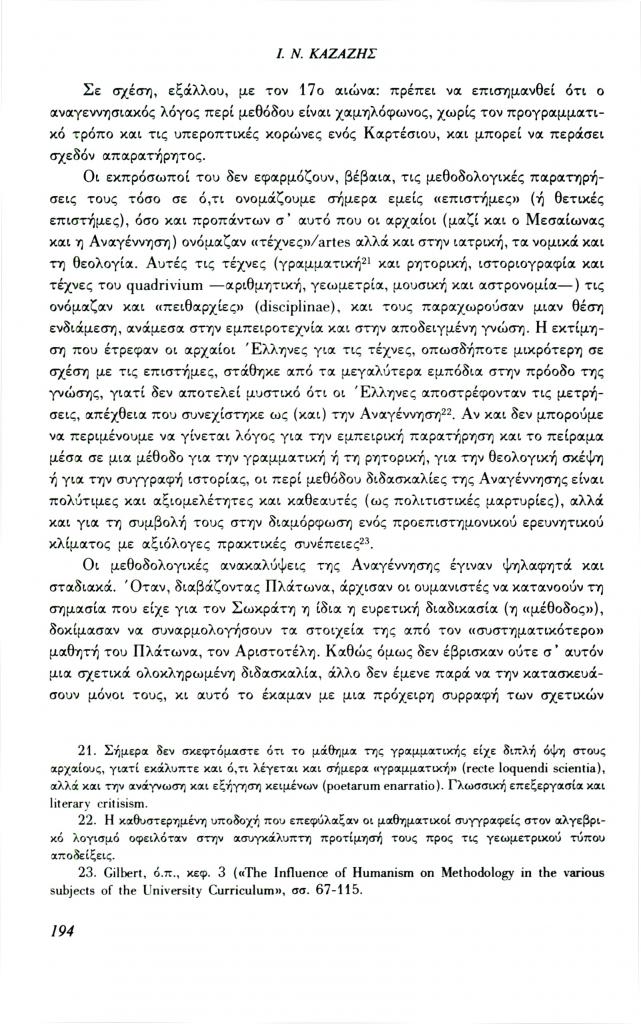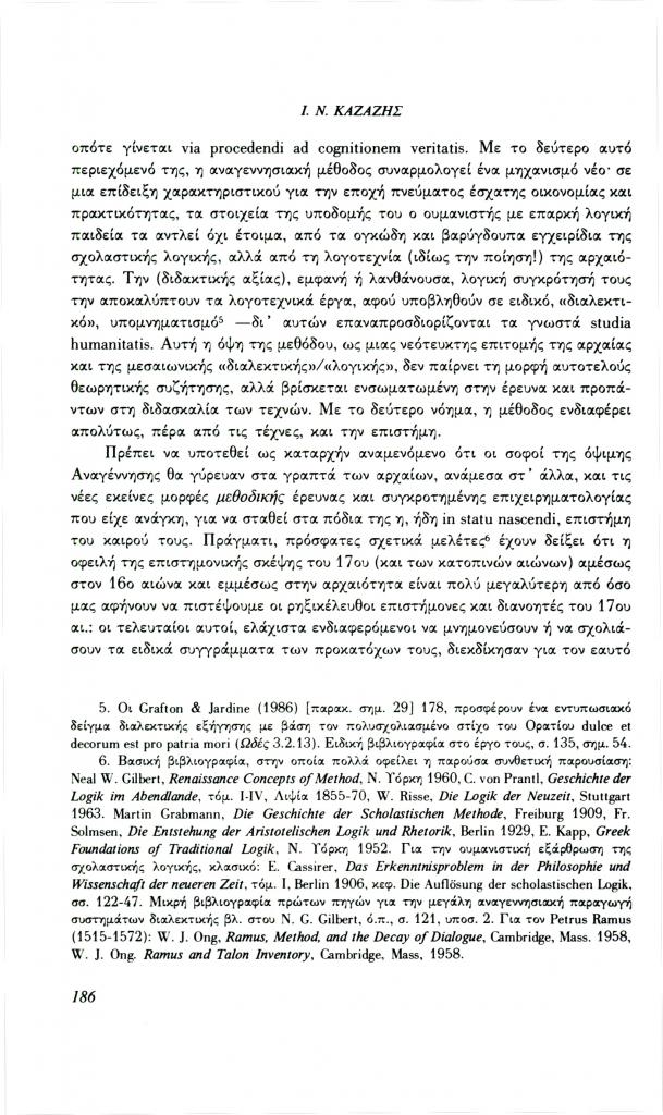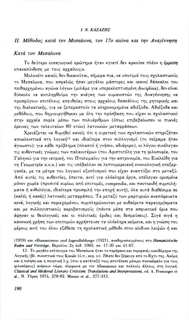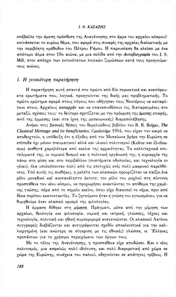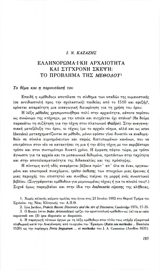 Καζάζης Ιωάννης Ν., «Ελληνορωμαϊκή αρχαιότητα και σύγχρονη σκέψη: Το πρόβλημα της μεθόδου», Φιλόλογος, τχ. 69 (Φθινόπωρο 1992), σ. 185-209