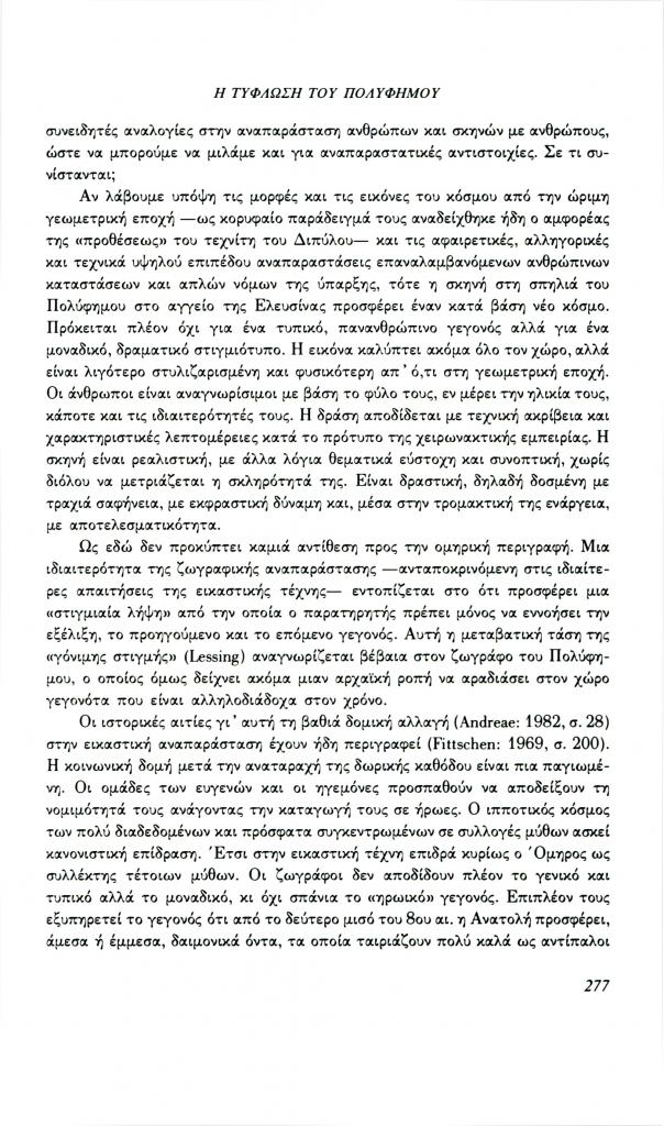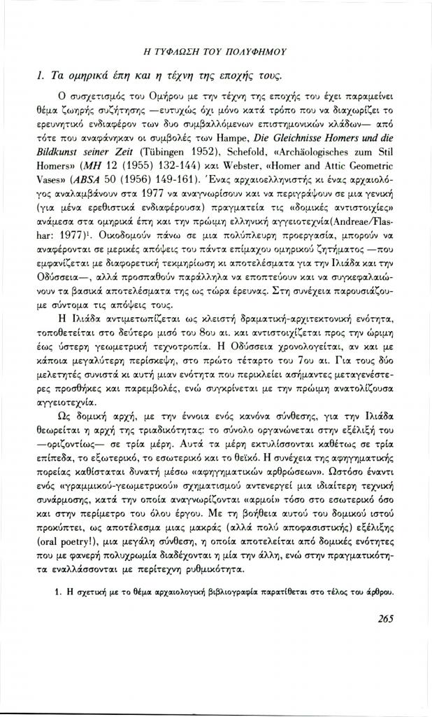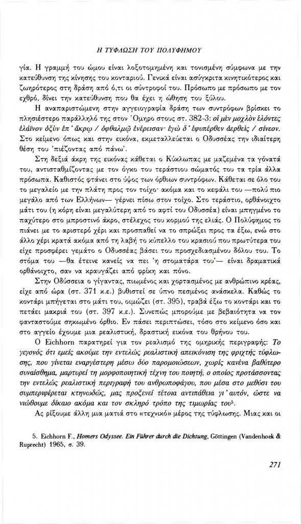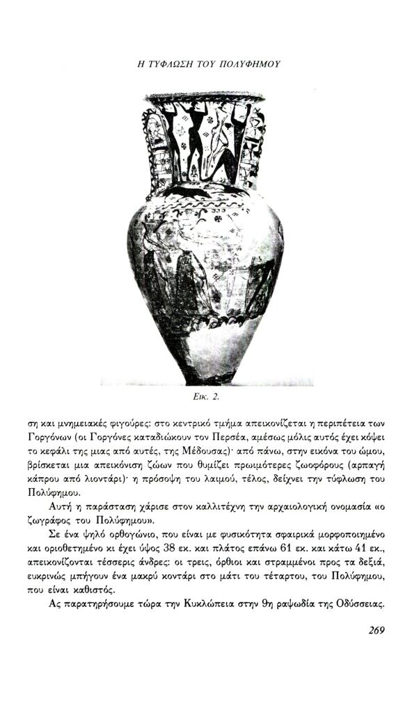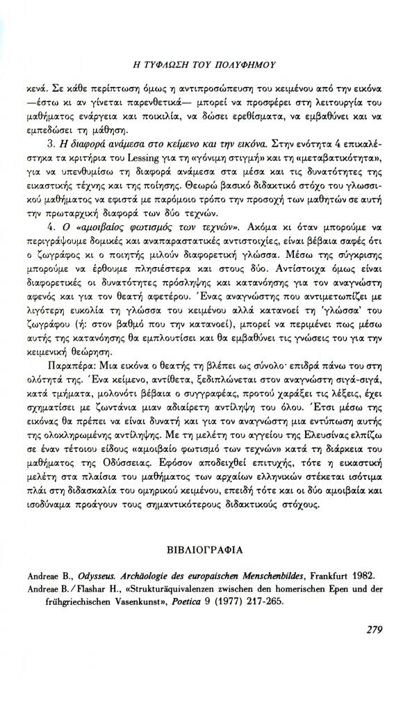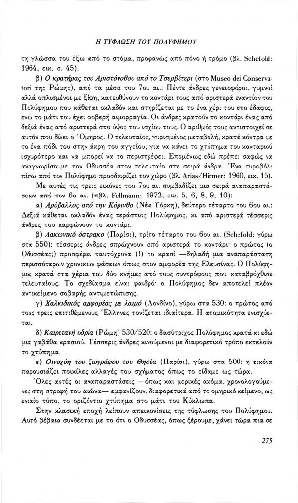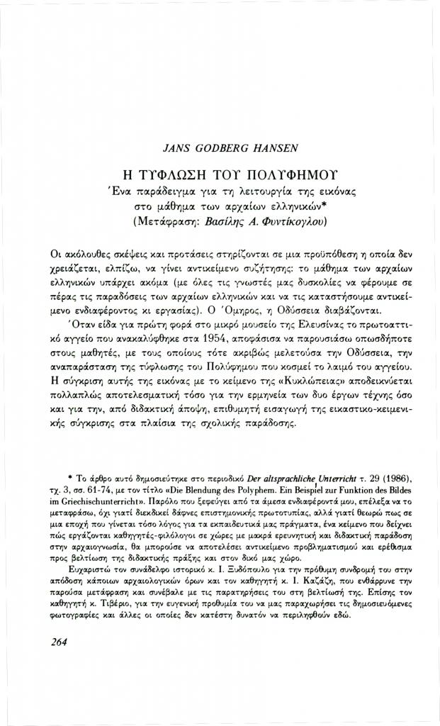 , «Η τύφλωση του Πολύφημου. Ένα παράδειγμα για τη λειτουργία της εικόνας στο μάθημα των αρχαίων ελληνικών», Φιλόλογος, τχ. 70 (Χειμώνας 1992), σ. 264-280