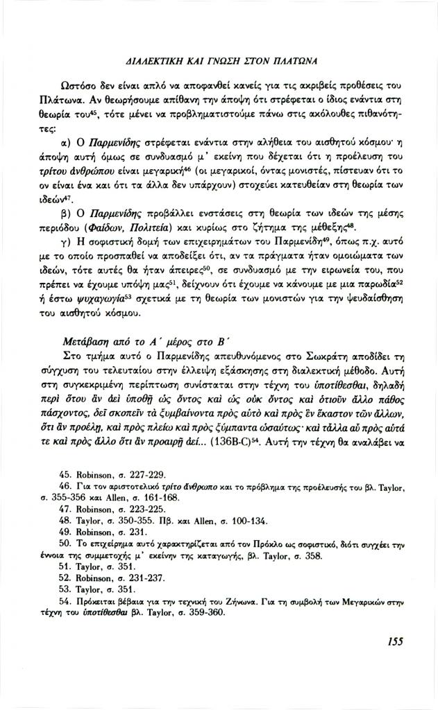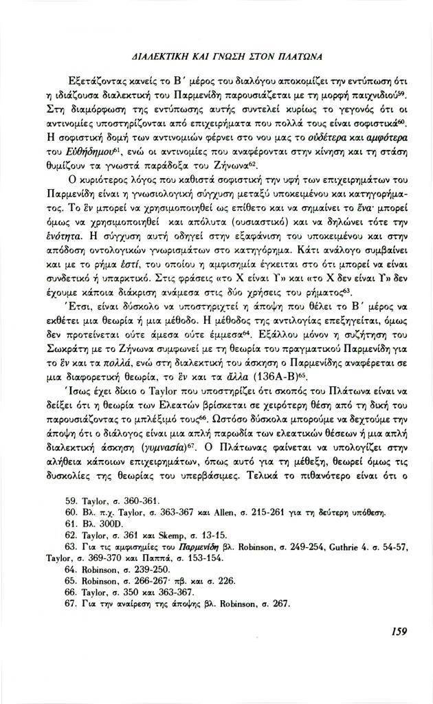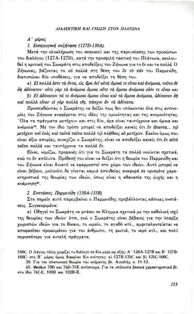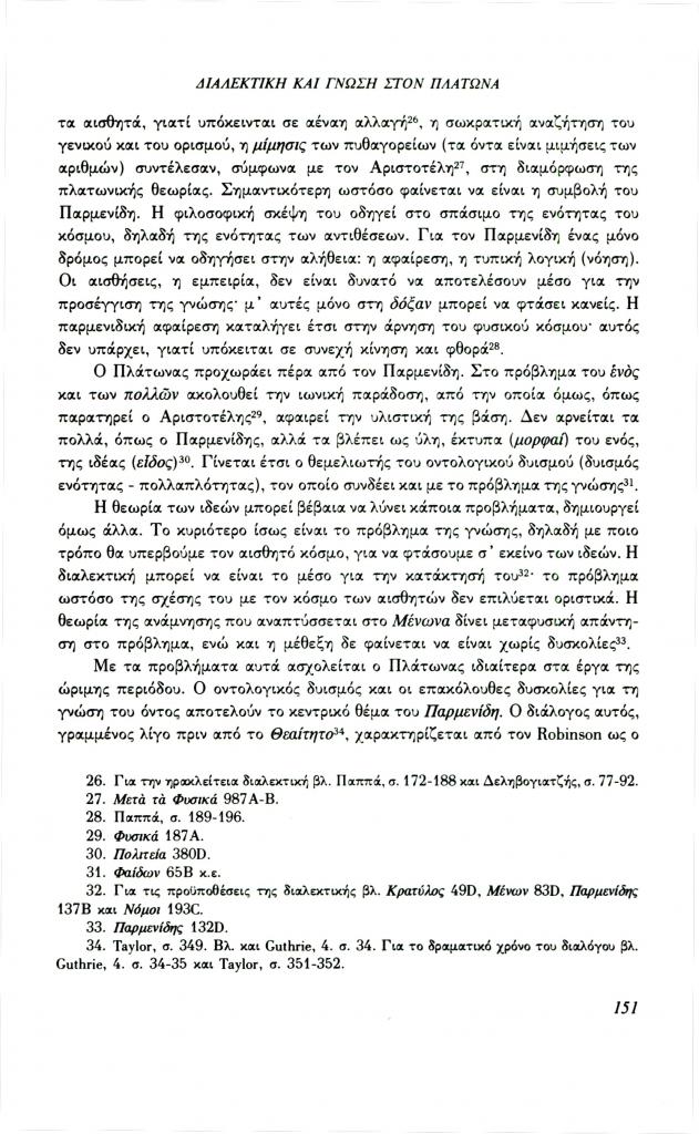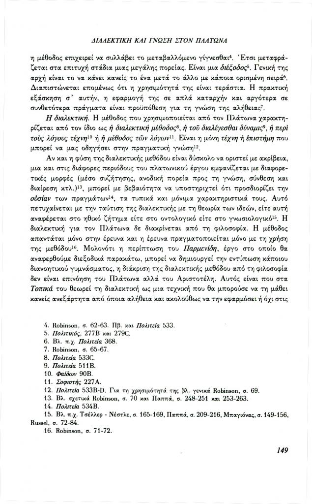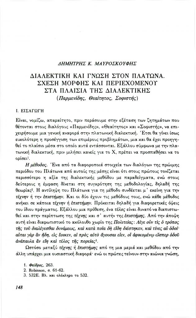 , «Διαλεκτική και γνώση στον Πλάτωνα. Σχέση μορφής και περιεχομένου στα πλαίσια της διαλεκτικής (Παρμενίδης, Θεαίτητος, Σοφιστής)», Φιλόλογος, τχ. 72 (Καλοκαίρι 1993), σ. 148-160