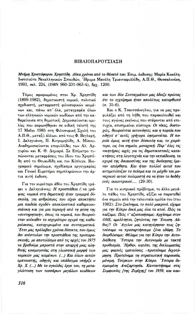 Καζάζης Ιωάννης Ν., «Βιβλιοπαρουσίαση. Μνήμη Χριστόφορου Χρηστίδη. Δέκα χρόνια από το θάνατό του: Επιμ. έκδοσης: Μαρία Κοκόλη. Ινστιτούτο Νεοελληνικών Σπουδών, Ίδρυμα Μανόλη Τριανταφυλλίδη, Α.Π.Θ., Θεσσαλονίκη, 1993, σελ. 224, (ISBN 960-231-063-4), δρχ. 1200», Φιλόλογος, τχ. 74 (Χειμώνας 1993), σ. 316-317
