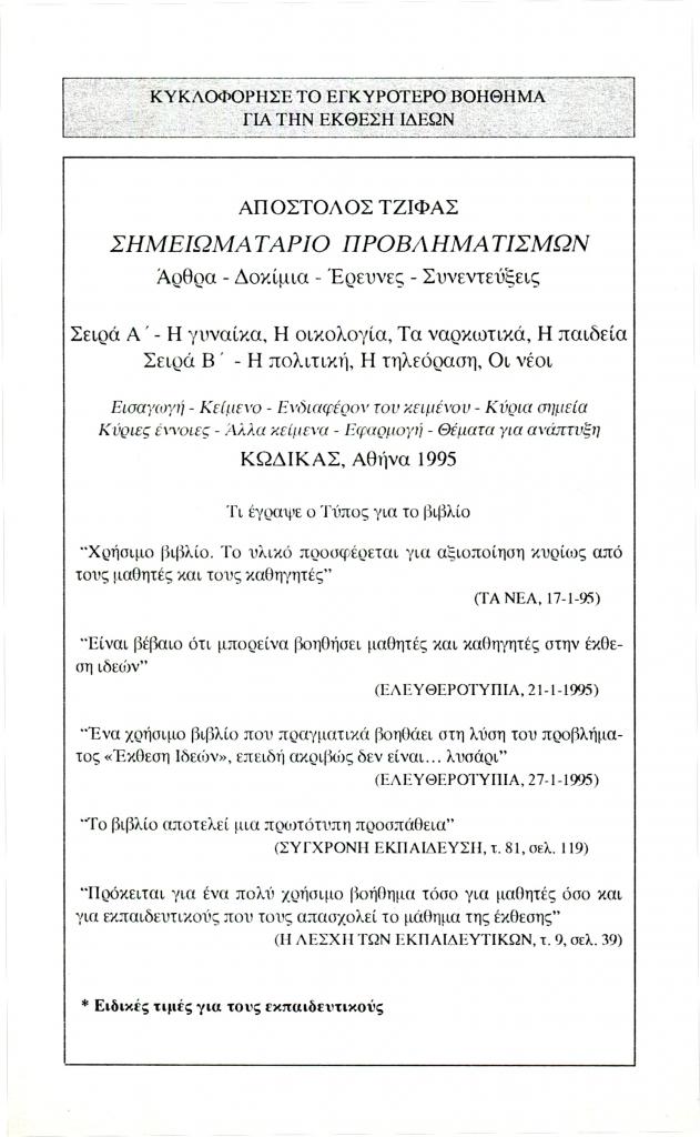 «Κυκλοφόρησε το εγκυρότερο βοήθημα για την έκθεση ιδεών. Απόστολος Τζίφας Σημειωματάριο προβληματισμών. Άρθρα – Δοκίμια – Έρευνες – Συνεντεύξεις», Φιλόλογος, τχ. 82 (Χειμώνας 1995), σ. 324
