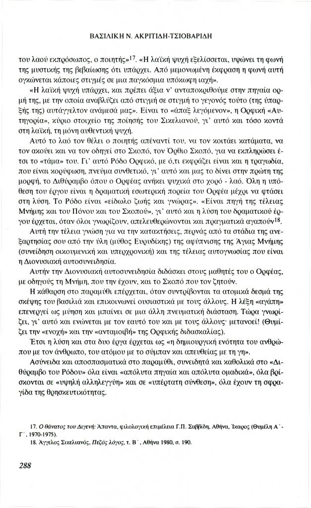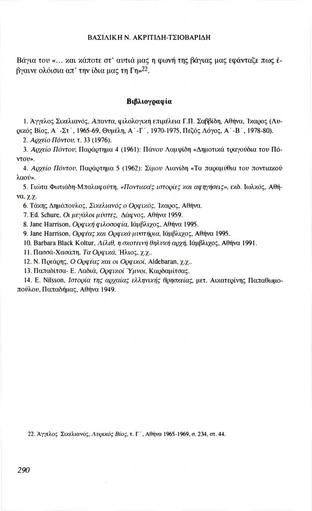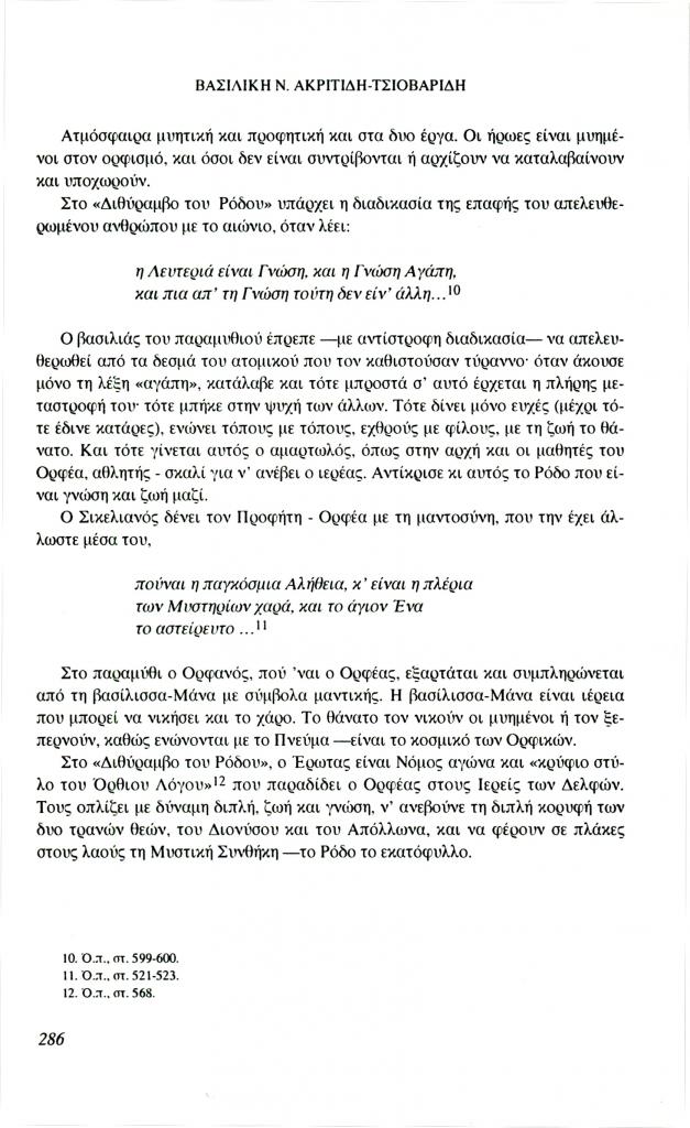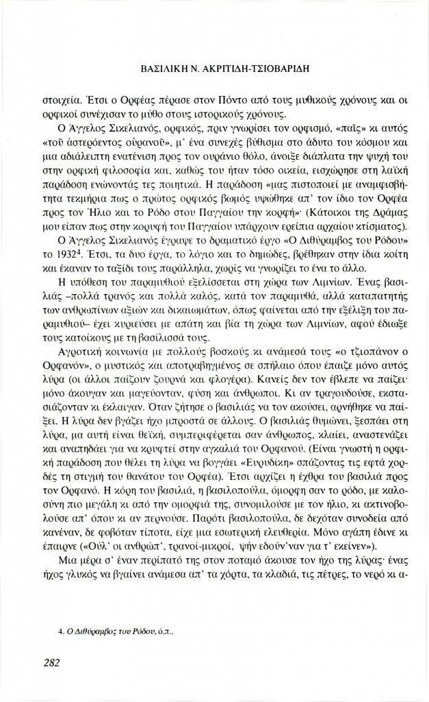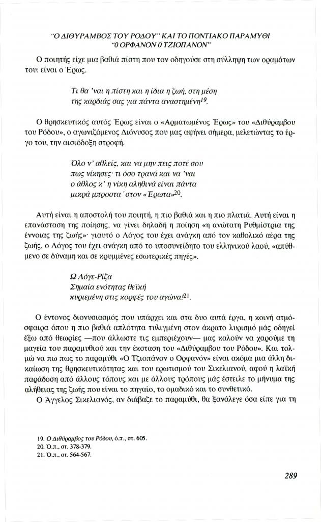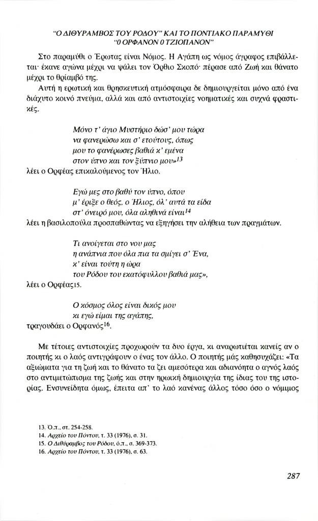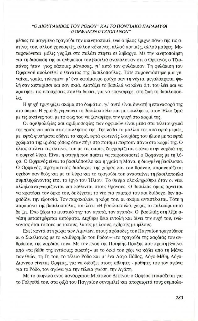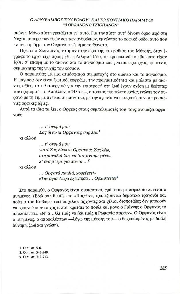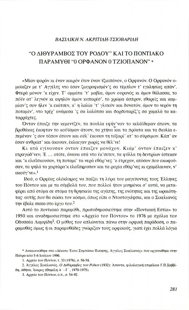, «Ο Διθύραμβος του Ρόδου και το ποντιακό παραμύθι Ο Ορφανόν ο Τζιοπάνον», Φιλόλογος, τχ. 85 (Φθινόπωρο 1996), σ. 281-290
