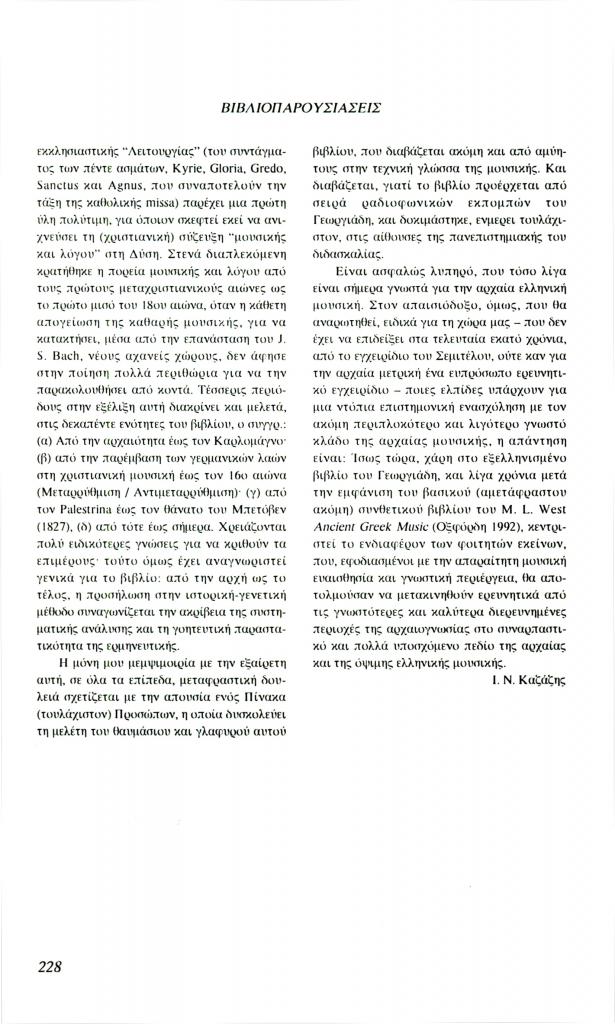 , «Βιβλιοπαρουσιάσεις. Θρασύβουλος Γ. Γεωργιάδης, Μουσική και Γλώσσα: Το ιστορικό γίγνεσθαι της δυτικής μουσικής στη μελοποίηση της λειτουργίας, (1954). Μετάφραση από τα γερμανικά του Δημήτρη Θέμελη, Αθήνα: Εκδ. Νεφέλη 1994», Φιλόλογος, τχ. 88 (Καλοκαίρι 1997), σ. 227-228