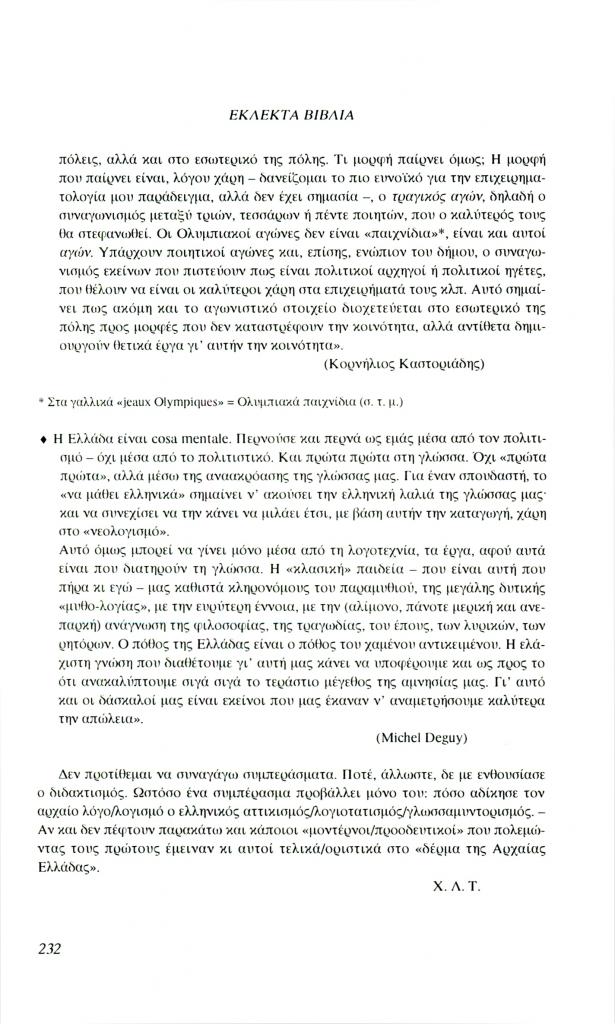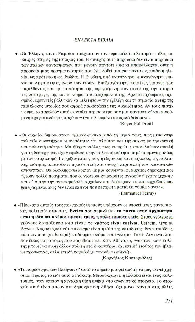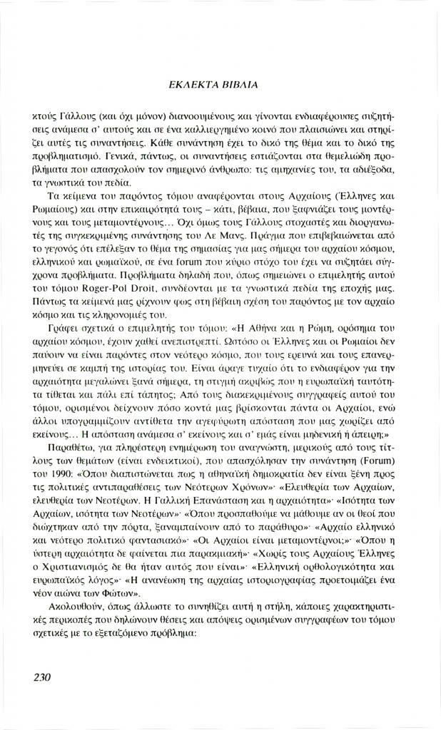 , «Εκλεκτά βιβλία. Οι Έλληνες, οι Ρωμαίοι κι εμείς. Η επικαιρότητα του αρχαίου κόσμου», Φιλόλογος, τχ. 88 (Καλοκαίρι 1997), σ. 229-232