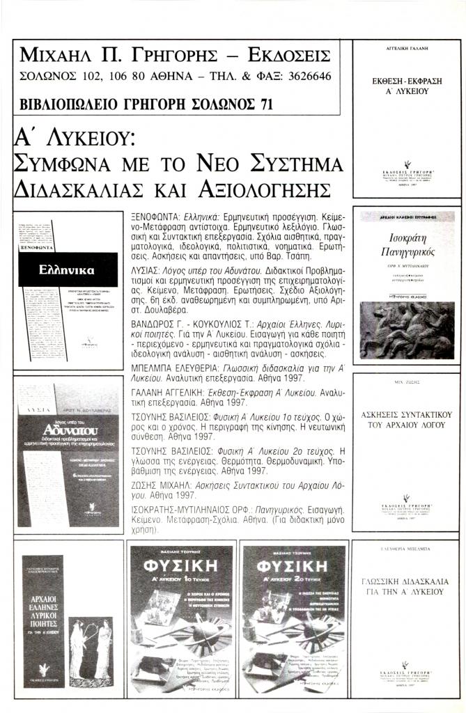 «Μιχαήλ Π. Γρηγόρης Εκδόσεις. Βιβλιοπωλείο Γρηγόρη. Α΄ Λυκείου: Σύμφωνα με το νέο σύστημα διδασκαλίας και αξιολόγησης», Φιλόλογος, τχ. 90 (Χειμώνας 1997), σ. 503