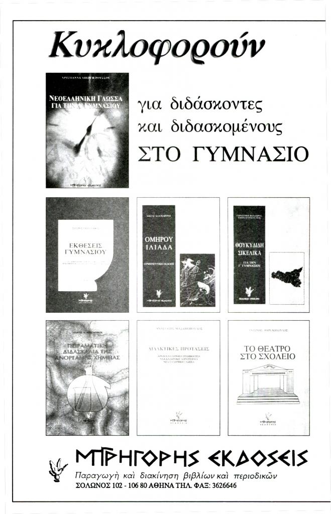 «Κυκλοφορούν για διδάσκοντες και διδασκομένους στο Γυμνάσιο. Μιχαήλ Π. Γρηγόρης Εκδόσεις», Φιλόλογος, τχ. 91 (Άνοιξη 1998), σ. 125