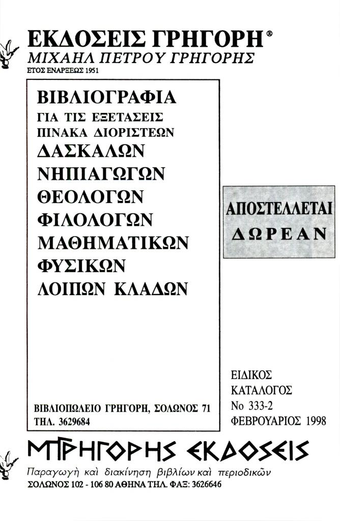 «Εκδόσεις Γρηγόρη. Βιβλιογραφία για τις εξετάσεις πίνακα διοριστέων», Φιλόλογος, τχ. 91 (Άνοιξη 1998), σ. 126