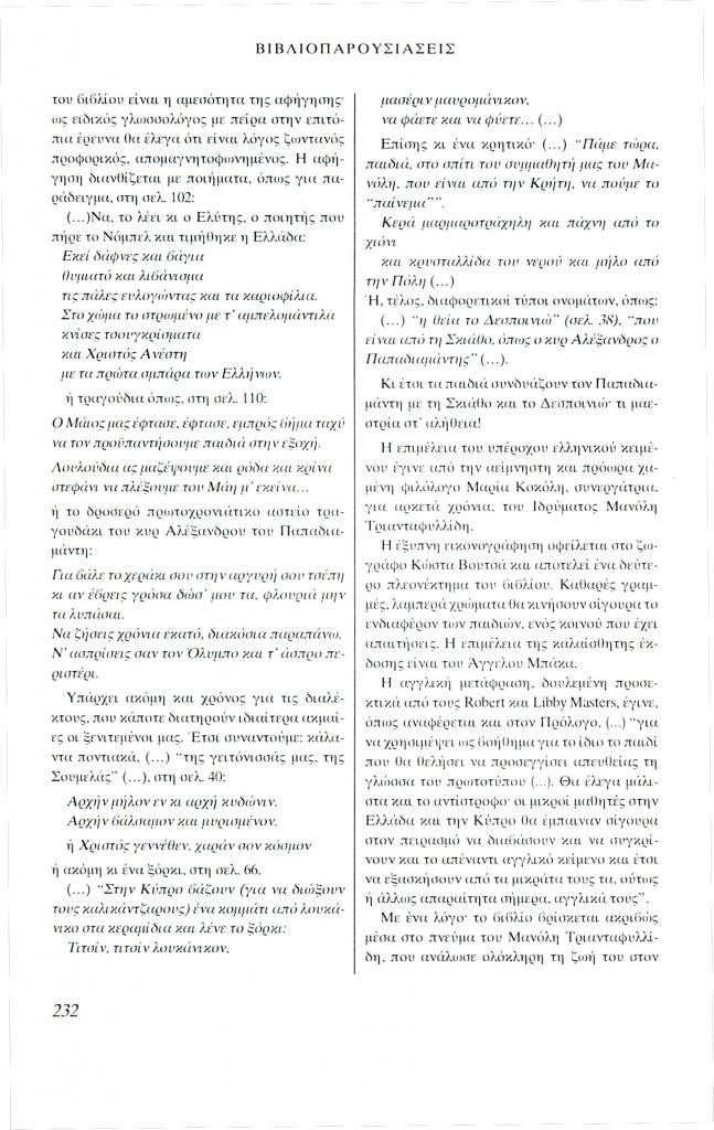 , «Βιβλιοπαρουσιάσεις. Νίνας Κοκκαλίδου-Ναχμία, Όταν οι Έλληνες γιορτάζουν… Greeks in a festive mood. – Δίγλωσση έκδοση. Θεσσαλονίκη: ΑΠΘ, Ινστιτούτο Νεοελληνικών Σπουδών (Ίδρυμα Μανόλη Τριανταφυλλίδη), 1995. – 159 σελ.», Φιλόλογος, τχ. 92 (Καλοκαίρι 1998), σ. 231-234